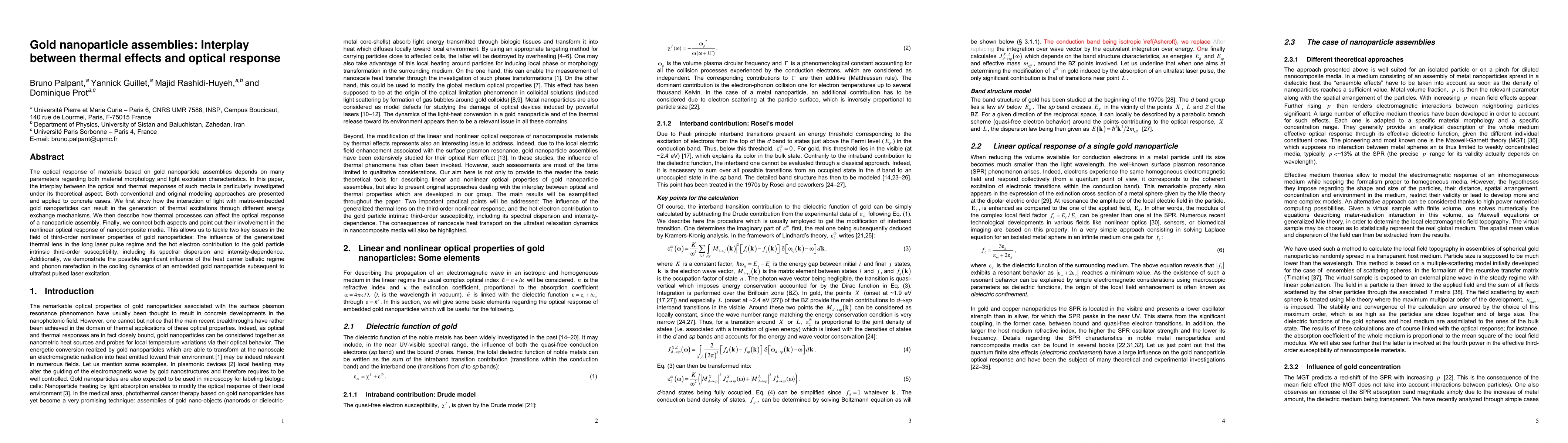 This paper investigates the interplay between optical and thermal responses in gold nanoparticle assemblies, employing both conventional and novel modeling approaches. It highlights how light-induced thermal excitations affect the optical response, addressing key issues like the thermal lens effect and the hot electron contribution to third-order nonlinear properties.