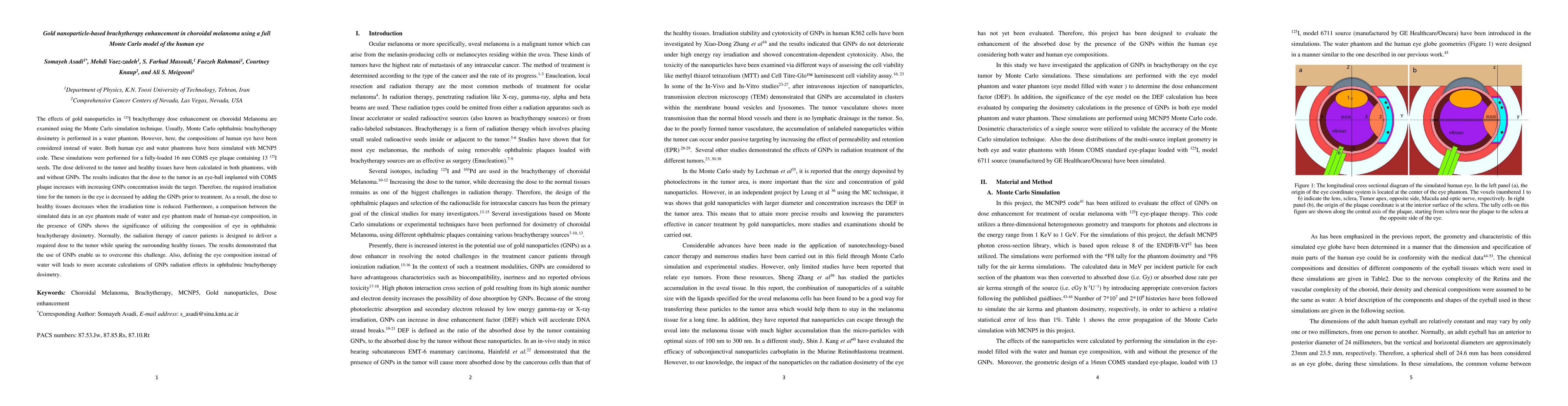 This study uses Monte Carlo simulations to evaluate how gold nanoparticles enhance brachytherapy dose delivery for choroidal melanoma, comparing human eye composition to water phantoms. Results show that gold nanoparticles increase tumor dose and reduce treatment time, thereby lowering doses to healthy tissues, and highlight the importance of using accurate eye composition for dosimetry.