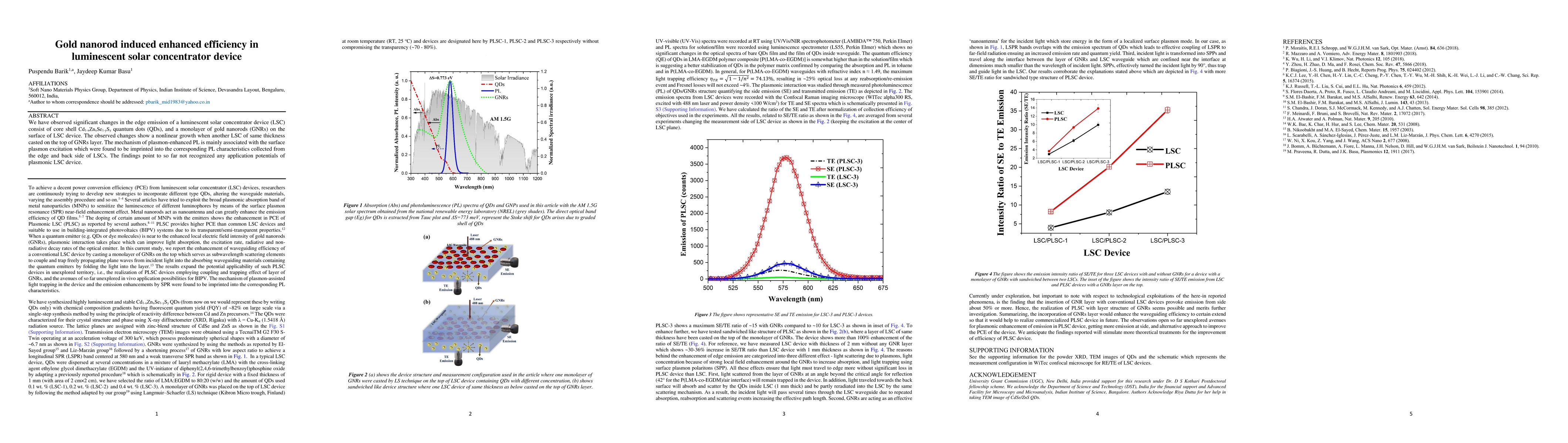 The paper presents a novel method for enhancing the efficiency of luminescent solar concentrator devices by incorporating a monolayer of gold nanorods, leading to improved light trapping and edge emission.
