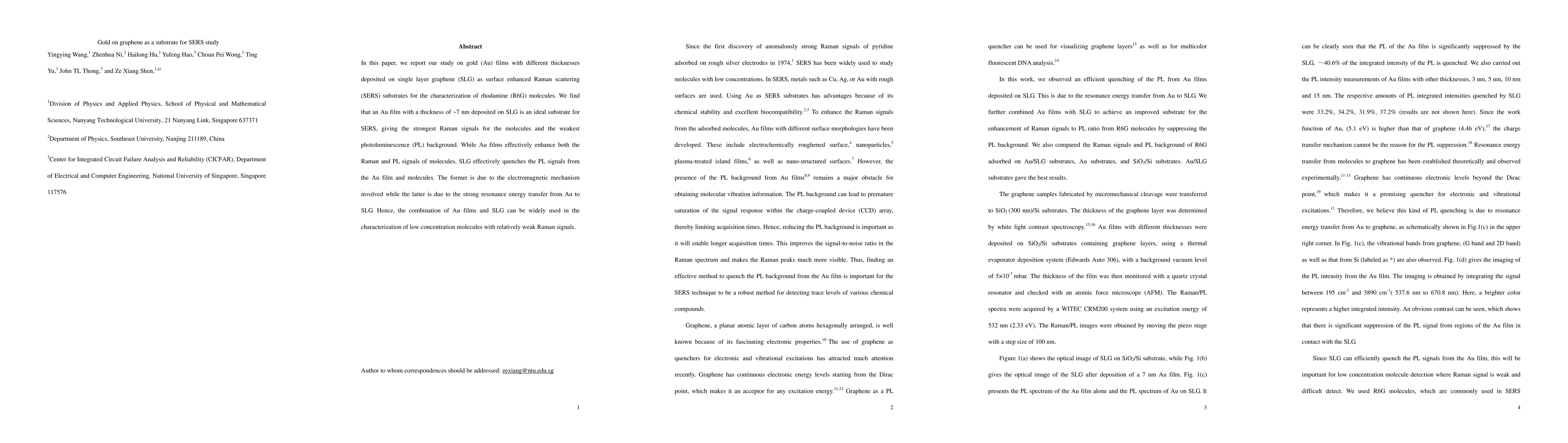 In this paper, we report our study on gold (Au) films with different thicknesses deposited on single layer graphene (SLG) as surface enhanced Raman scattering (SERS) substrates for the characterization of rhodamine (R6G) molecules. We find that an Au film with a thickness of ~7 nm deposited on SLG is an ideal substrate for SERS, giving the strongest Raman signals for the molecules and the weakest photoluminescence (PL) background. While Au films effectively enhance both the Raman and PL signals of molecules, SLG effectively quenches the PL signals from the Au film and molecules. The former is due to the electromagnetic mechanism involved while the latter is due to the strong resonance energy transfer from Au to SLG. Hence, the combination of Au films and SLG can be widely used in the characterization of low concentration molecules with relatively weak Raman signals.