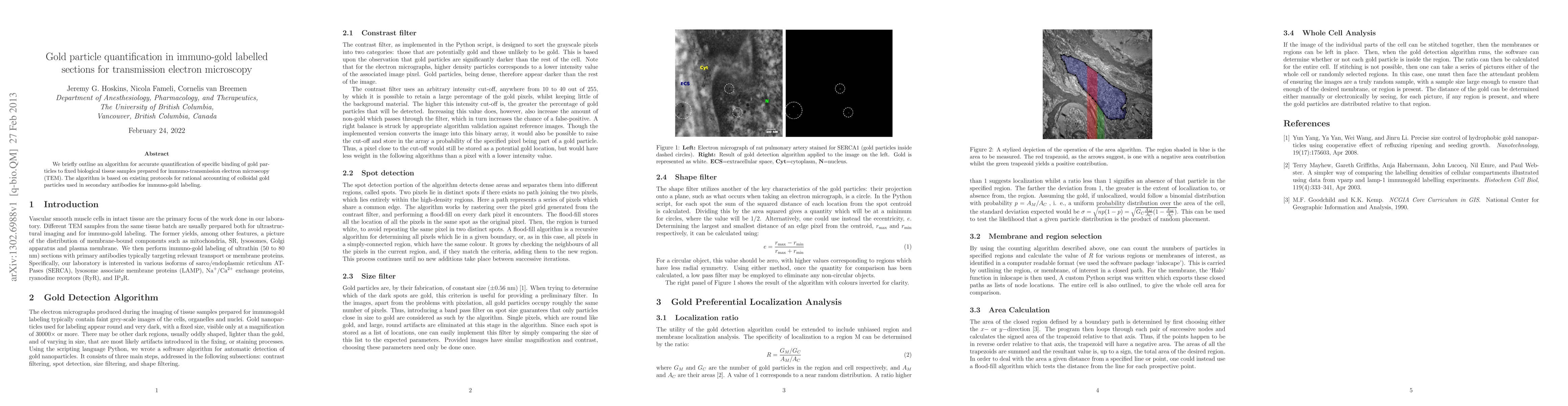 Summary: This paper presents an algorithm for accurate quantification of gold particles in immuno-gold labeled sections for transmission electron microscopy, improving the precision of counting colloidal gold particles used in secondary antibodies for immuno-labeling.