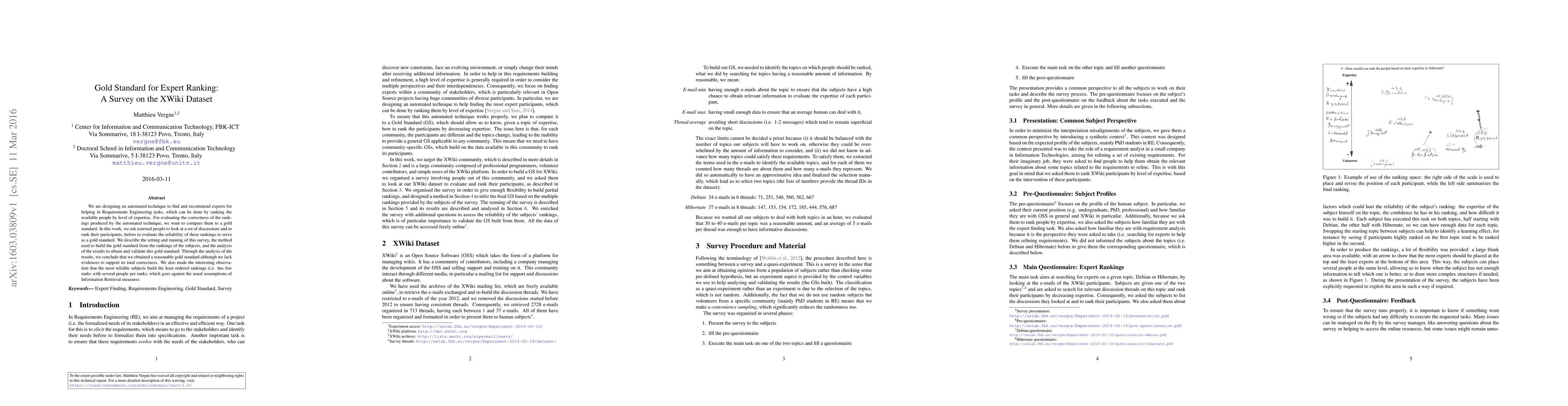 This paper surveys external participants to rank experts in Requirements Engineering discussions, aiming to create a gold standard for evaluating automated expert ranking techniques. The study concludes that while a reasonable gold standard was obtained, there is insufficient evidence for its complete correctness, and it notes an unexpected trend where the most reliable experts produce less ordered rankings.