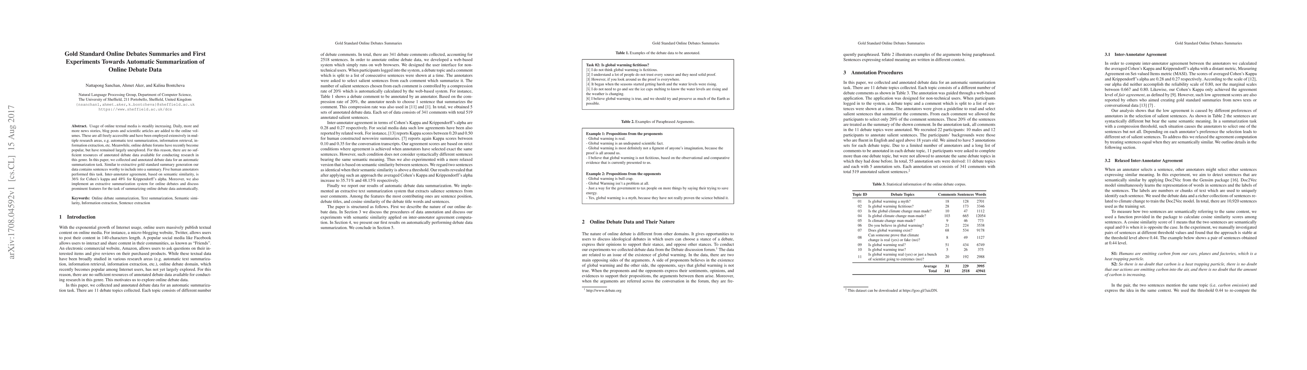 Usage of online textual media is steadily increasing. Daily, more and more news stories, blog posts and scientific articles are added to the online volumes. These are all freely accessible and have been employed extensively in multiple research areas, e.g. automatic text summarization, information retrieval, information extraction, etc. Meanwhile, online debate forums have recently become popular, but have remained largely unexplored. For this reason, there are no sufficient resources of annotated debate data available for conducting research in this genre. In this paper, we collected and annotated debate data for an automatic summarization task. Similar to extractive gold standard summary generation our data contains sentences worthy to include into a summary. Five human annotators performed this task. Inter-annotator agreement, based on semantic similarity, is 36% for Cohen's kappa and 48% for Krippendorff's alpha. Moreover, we also implement an extractive summarization system for online debates and discuss prominent features for the task of summarizing online debate data automatically.