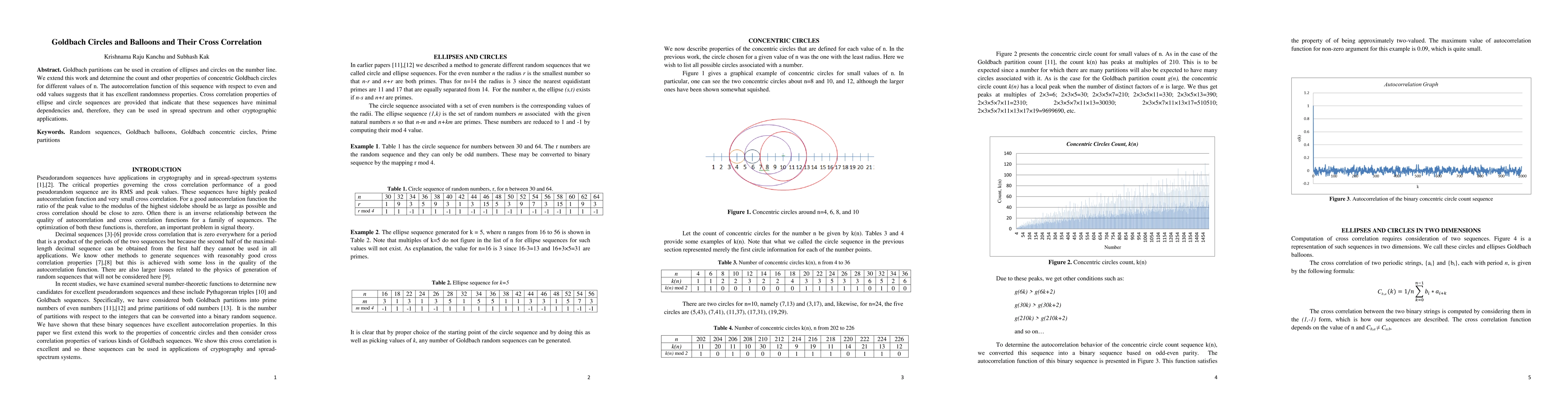 Goldbach partitions can be used in creation of ellipses and circles on the number line. We extend this work and determine the count and other properties of concentric Goldbach circles for different values of n. The autocorrelation function of this sequence with respect to even and odd values suggests that it has excellent randomness properties. Cross correlation properties of ellipse and circle sequences are provided that indicate that these sequences have minimal dependencies and, therefore, they can be used in spread spectrum and other cryptographic applications.