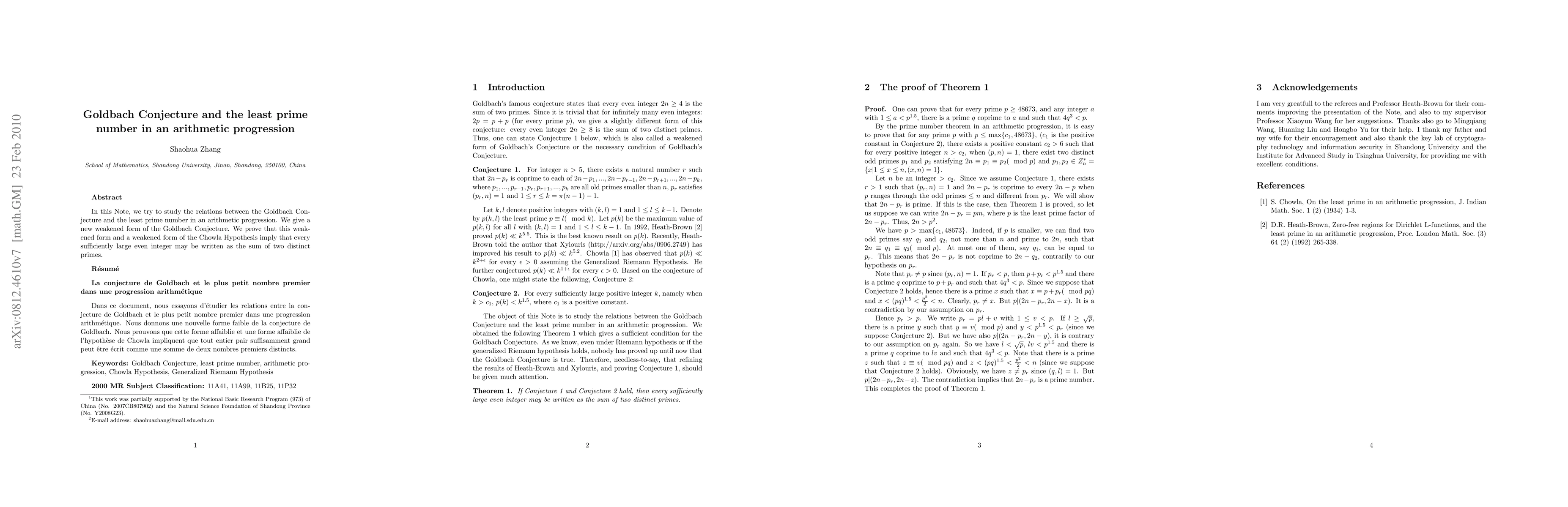 In this Note, we try to study the relations between the Goldbach Conjecture and the least prime number in an arithmetic progression. We give a new weakened form of the Goldbach Conjecture. We prove that this weakened form and a weakened form of the Chowla Hypothesis imply that every sufficiently large even integer may be written as the sum of two distinct primes. R\'{e}sum\'{e} La conjecture de Goldbach et le plus petit nombre premier dans une progression arithm\'{e}tique Dans ce document, nous essayons d'\'{e}tudier les relations entre la conjecture de Goldbach et le plus petit nombre premier dans une progression arithm\'{e}tique. Nous donnons une nouvelle forme faible de la conjecture de Goldbach. Nous prouvons que cette forme affaiblie et une forme affaiblie de l'hypoth\`{e}se de Chowla impliquent que tout entier pair suffisamment grand peut \^{e}tre \'{e}crit comme une somme de deux nombres premiers distincts.