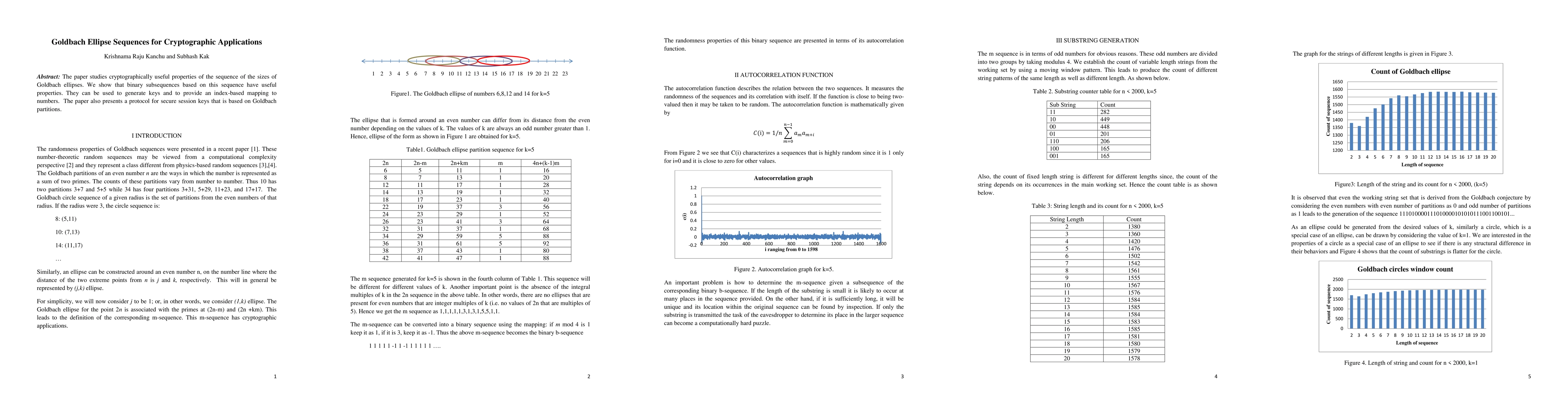 The paper studies cryptographically useful properties of the sequence of the sizes of Goldbach ellipses. We show that binary subsequences based on this sequence have useful properties. They can be used to generate keys and to provide an index-based mapping to numbers. The paper also presents a protocol for secure session keys that is based on Goldbach partitions.