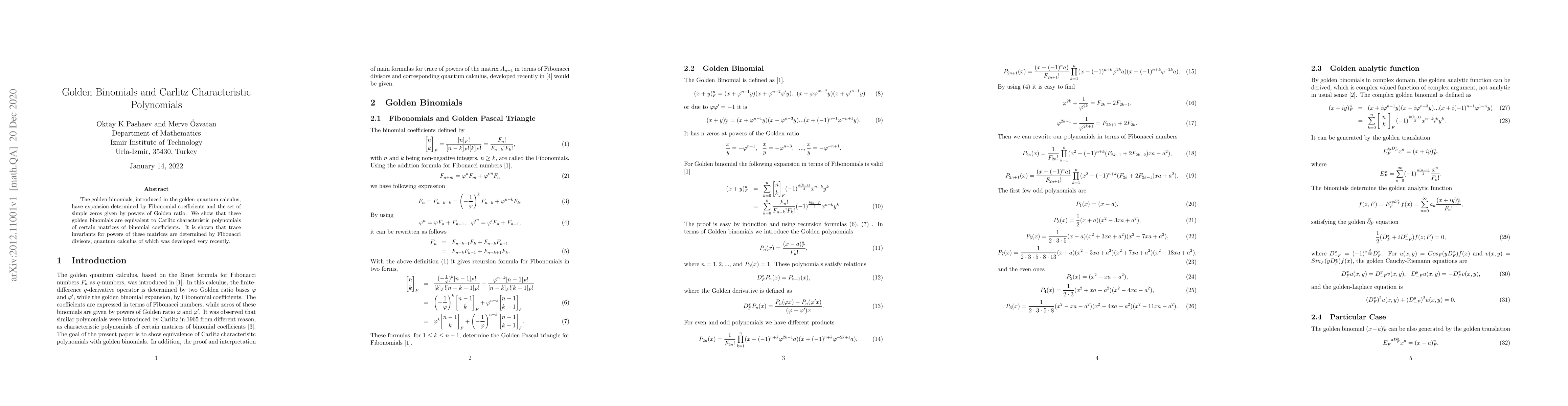 The golden binomials, introduced in the golden quantum calculus, have expansion determined by Fibonomial coefficients and the set of simple zeros given by powers of Golden ratio. We show that these golden binomials are equivalent to Carlitz characteristic polynomials of certain matrices of binomial coefficients. It is shown that trace invariants for powers of these matrices are determined by Fibonacci divisors, quantum calculus of which was developed very recently.