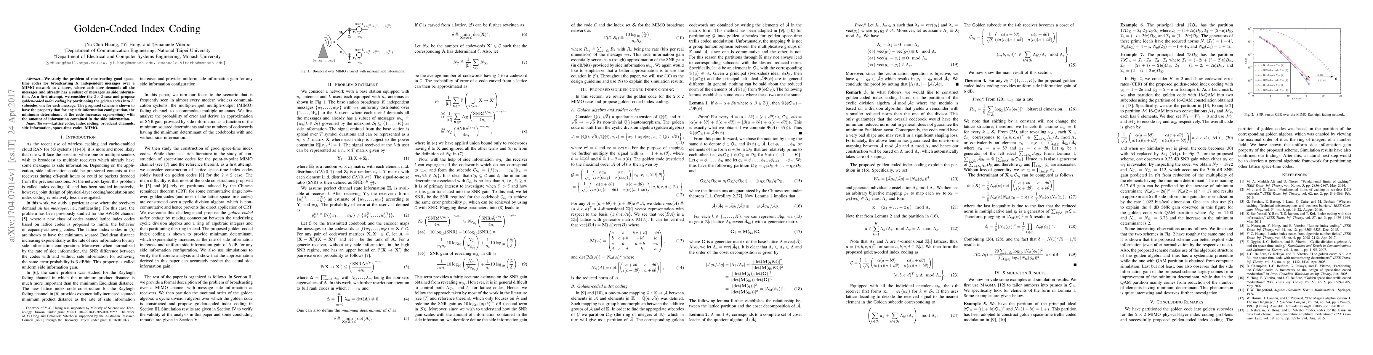 We study the problem of constructing good space-time codes for broadcasting $K$ independent messages over a MIMO network to $L$ users, where each user demands all the messages and already has a subset of messages as side information. As a first attempt, we consider the $2\times 2$ case and propose golden-coded index coding by partitioning the golden codes into $K$ subcodes, one for each message. The proposed scheme is shown to have the property that for any side information configuration, the minimum determinant of the code increases exponentially with the amount of information contained in the side information.