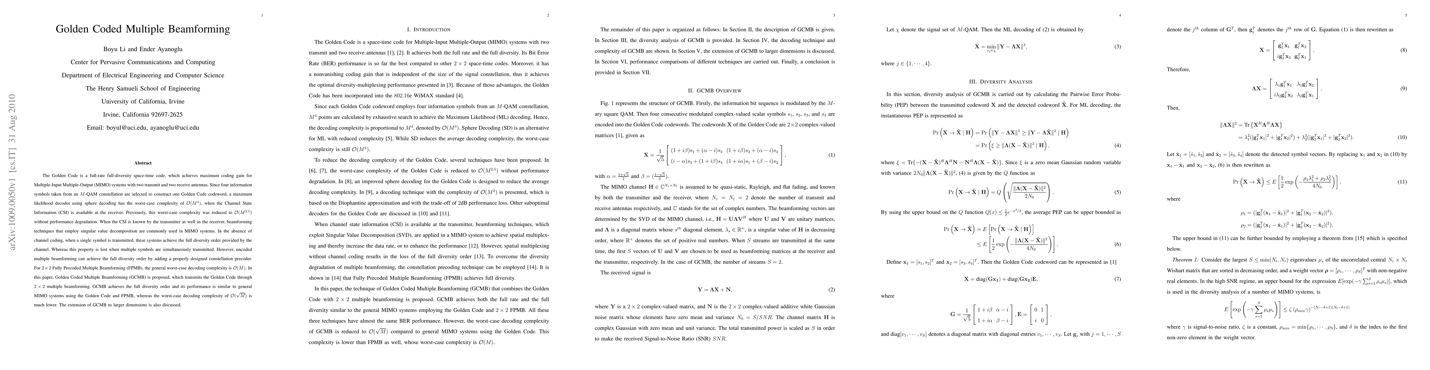This paper proposes Golden Coded Multiple Beamforming (GCMB) for 2×2 MIMO systems, achieving full diversity order with a significantly lower worst-case decoding complexity of O(√M) compared to O(M^4) for traditional methods. GCMB combines the Golden Code with beamforming to enhance performance while reducing complexity.