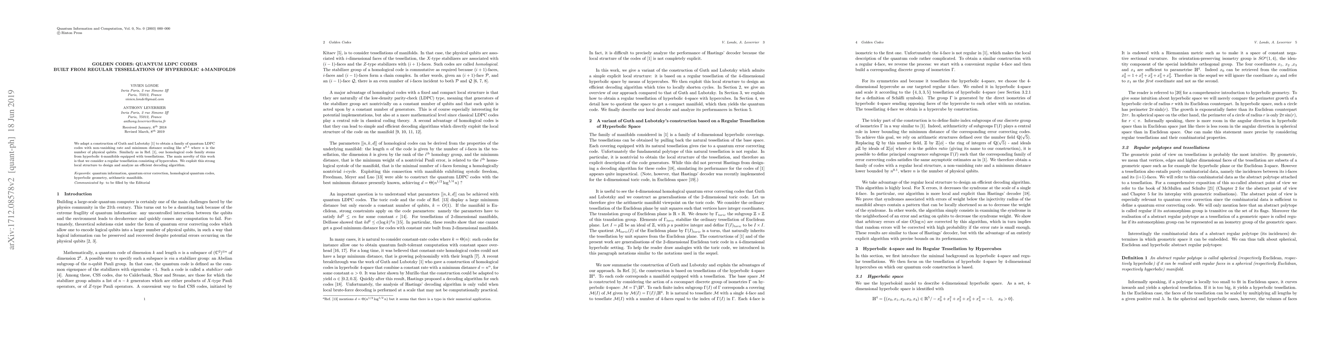 We adapt a construction of Guth and Lubotzky [arXiv:1310.5555] to obtain a family of quantum LDPC codes with non-vanishing rate and minimum distance scaling like $n^{0.1}$ where $n$ is the number of physical qubits. Similarly as in [arXiv:1310.5555], our homological code family stems from hyperbolic 4-manifolds equipped with tessellations. The main novelty of this work is that we consider a regular tessellation consisting of hypercubes. We exploit this strong local structure to design and analyze an efficient decoding algorithm.