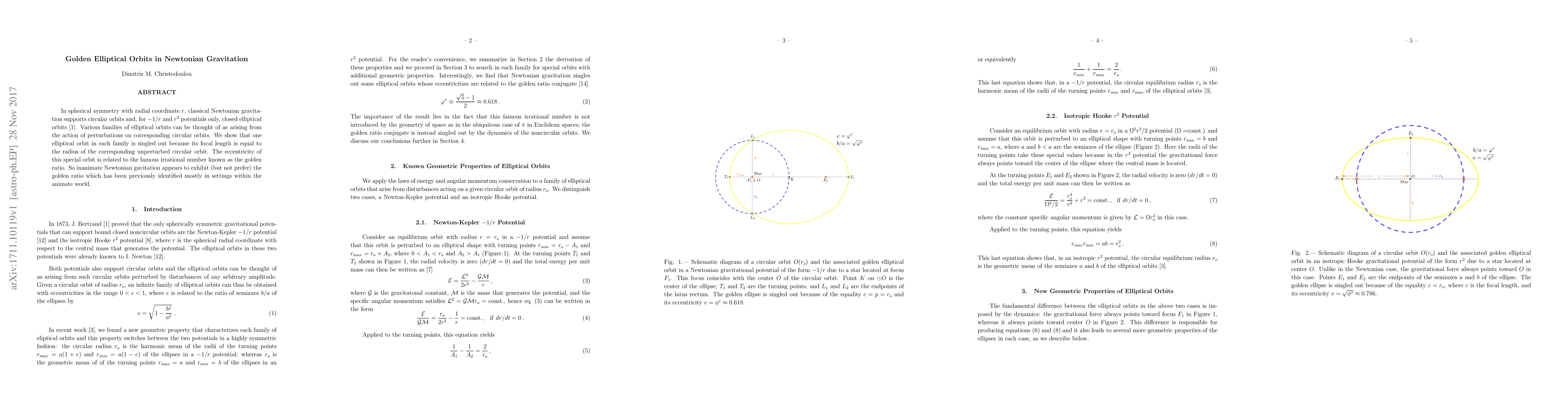 In spherical symmetry with radial coordinate $r$, classical Newtonian gravitation supports circular orbits and, for $-1/r$ and $r^2$ potentials only, closed elliptical orbits [1]. Various families of elliptical orbits can be thought of as arising from the action of perturbations on corresponding circular orbits. We show that one elliptical orbit in each family is singled out because its focal length is equal to the radius of the corresponding unperturbed circular orbit. The eccentricity of this special orbit is related to the famous irrational number known as the golden ratio. So inanimate Newtonian gravitation appears to exhibit (but not prefer) the golden ratio which has been previously identified mostly in settings within the animate world.