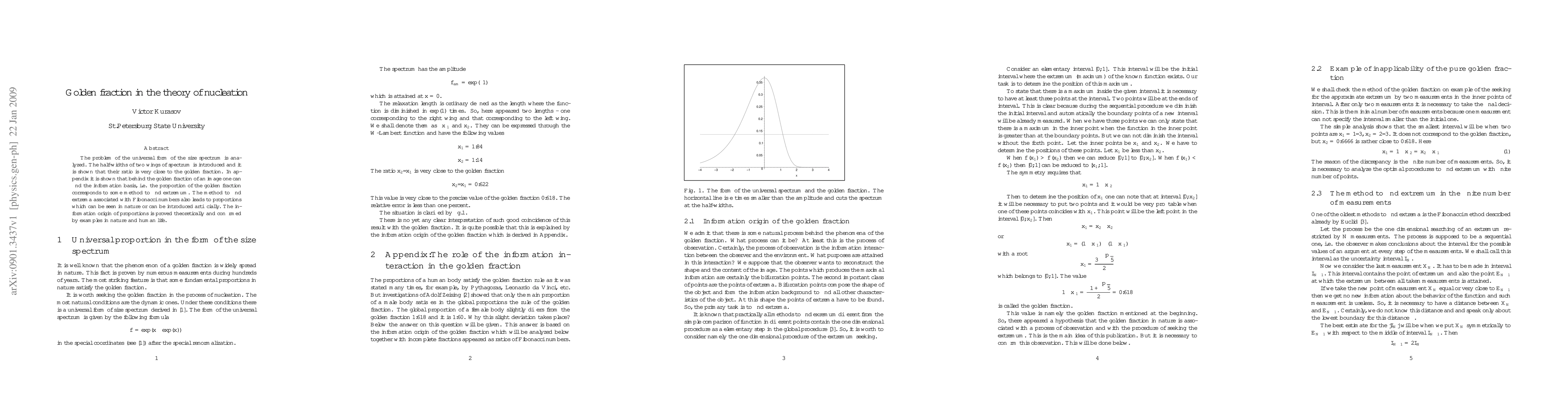 The problem of the universal form of the size spectrum is analyzed. The half-widths of two wings of spectrum is introduced and it is shown that their ratio is very close to the golden fraction. In appendix it is shown that behind the golden fraction of an image one can find the information basis, i.e. the proportion of the golden fraction corresponds to some method to find extremum. The method to find extrema associated with Fibonacci numbers also leads to proportions which can be seen in nature or can be introduced artificially. The information origin of proportions is proved theoretically and confirmed by examples in nature and human life.