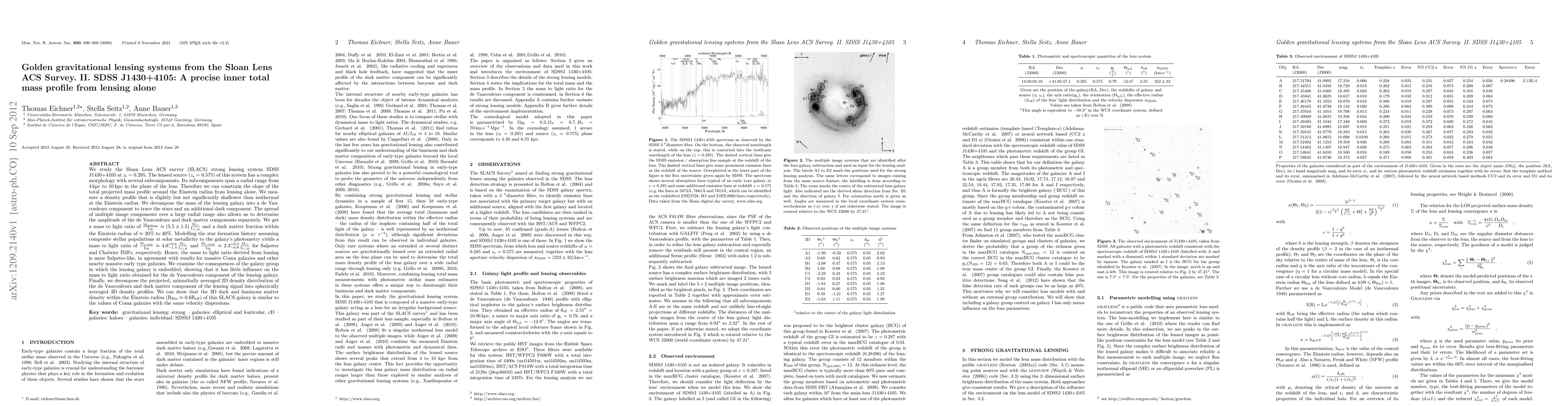 We study the SLACS strong lensing system SDSSJ1430+4105 at z=0.285. The lensed source (z=0.575) of this system has a complex morphology with several subcomponents. Its subcomponents span a radial range from 4 to 10kpc in the lens plane. Therefore we can constrain the slope of the total projected mass profile around the Einstein radius (R_E) from lensing alone. We measure a density profile that is slightly but not significantly shallower than isothermal at R_E. We decompose the mass of the lensing galaxy into a de Vaucouleurs (deV) component to trace the stars and an additional dark component. The spread of multiple image components over a large radial range also allows us to determine the amplitude of the deV and dark matter components separately. We get a mass to light ratio of M_deV/L_B~5.5\pm1.5M/L_sun,B and a dark matter fraction within R_E of ~20 to 40%. Modelling the star formation history assuming composite stellar populations at solar metallicity to the galaxy's photometry yields a mass to light ratio of M_star,salp/L_B~4.0_{-1.3}^{+0.6}M/L_sun,B and M_star,chab/L_B~2.3_{-0.8}^{+0.3}M/L_sun,B for Salpeter and Chabrier IMFs, respectively. Hence, the mass to light ratio derived from lensing is more Salpeter-like, in agreement with results for massive Coma galaxies and other nearby massive early type galaxies. We examine the consequences of the galaxy group in which the lensing galaxy is embedded, showing that it has little influence on the mass to light ratio obtained for the deV component of the lensing galaxy. Finally, we decompose the projected, azimuthally averaged 2D density distribution of the deV and dark matter component of the lensing signal into spherically averaged 3D density profiles. We can show that the 3D dark and luminous matter density within R_E~0.6R_eff of this SLACS galaxy is similar to the values of Coma galaxies with the same velocity dispersions.