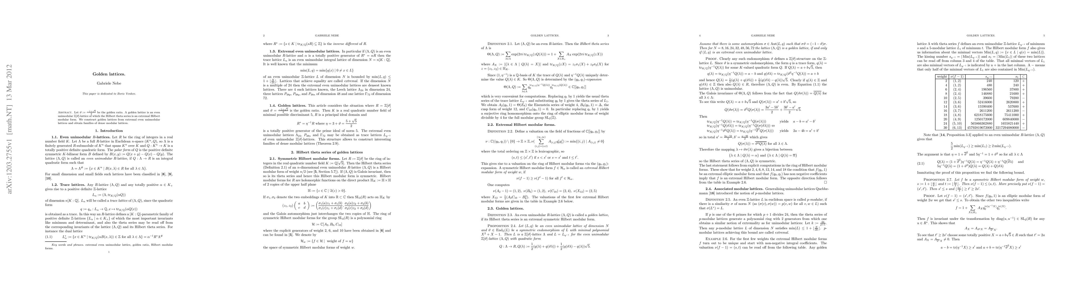 Summary: This paper constructs golden lattices from extremal even unimodular lattices, utilizing the golden ratio $\vartheta$, and explores their properties as dense modular lattices with extremal Hilbert modular forms.