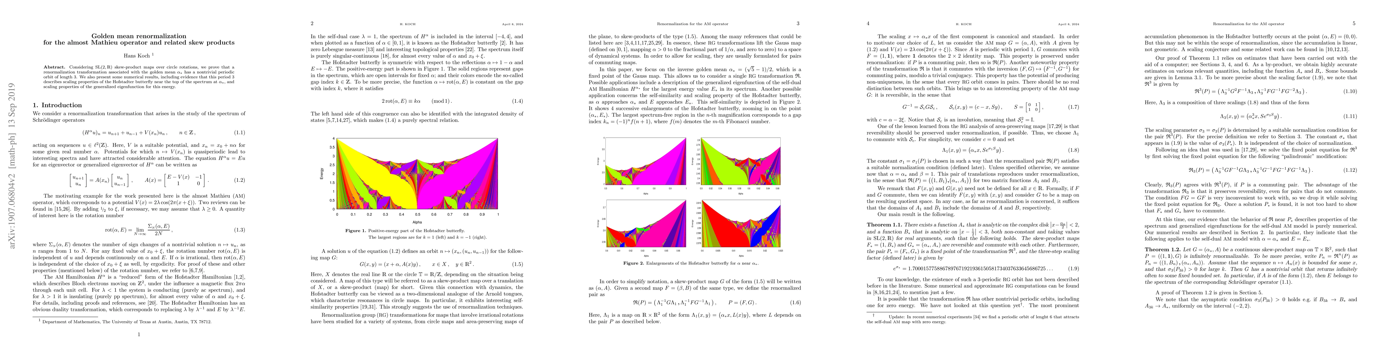 Considering SL(2,R) skew-product maps over circle rotations, we prove that a renormalization transformation associated with the golden mean alpha has a nontrivial periodic orbit of length 3. We also present some numerical results, including evidence this period 3 describes scaling properties of the Hofstadter butterfly near the top of the spectrum at alpha, and scaling properties of the generalized eigenfunction for this energy.