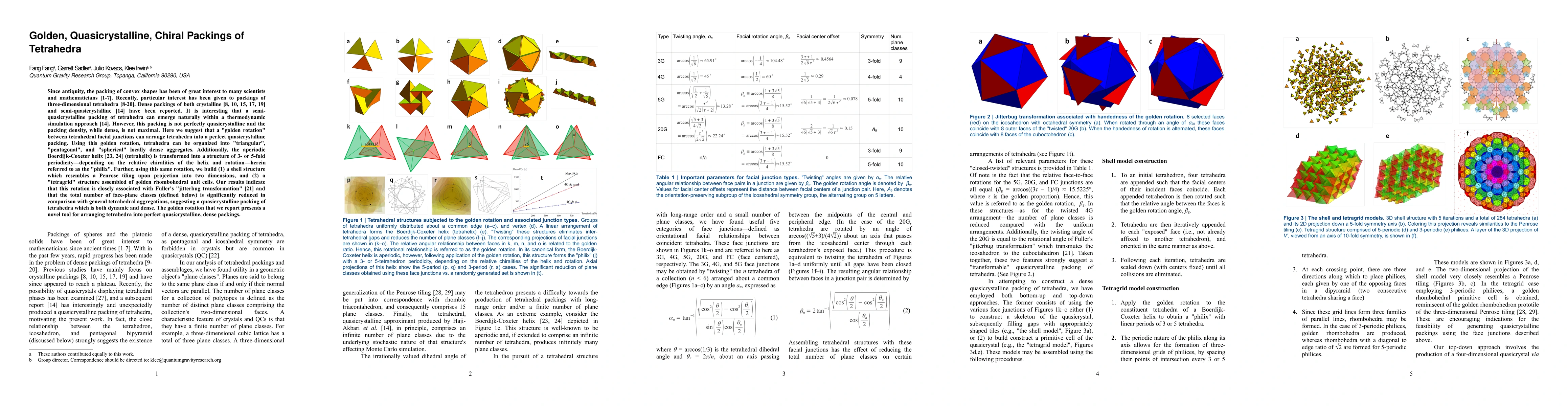 This paper explores the dense packing of three-dimensional tetrahedra, highlighting the emergence of semi-quasicrystalline packings through thermodynamic simulations. The authors propose a "golden rotation" technique to achieve a perfect quasicrystalline arrangement with maximal packing density.