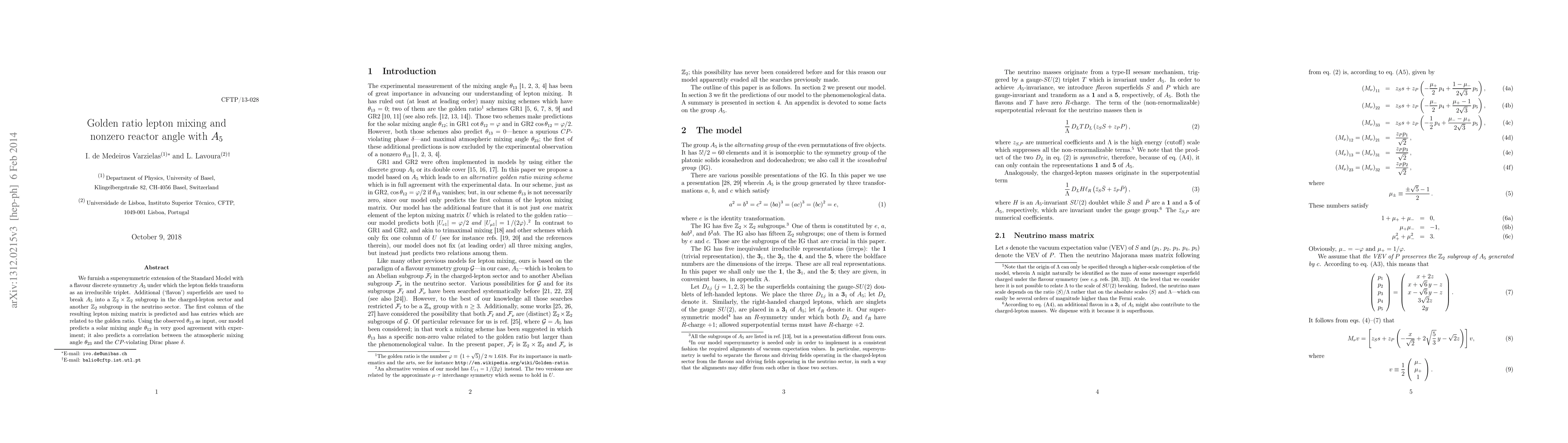 We furnish a supersymmetric extension of the Standard Model with a flavour discrete symmetry $A_5$ under which the lepton fields transform as an irreducible triplet. Additional (`flavon') superfields are used to break $A_5$ into a $\mathbb{Z}_2 \times \mathbb{Z}_2$ subgroup in the charged-lepton sector and another $\mathbb{Z}_2$ subgroup in the neutrino sector. The first column of the resulting lepton mixing matrix is predicted and has entries which are related to the golden ratio. Using the observed $\theta_{13}$ as input, our model predicts a solar mixing angle $\theta_{12}$ in very good agreement with experiment; it also predicts a correlation between the atmospheric mixing angle $\theta_{23}$ and the $CP$-violating Dirac phase $\delta$.