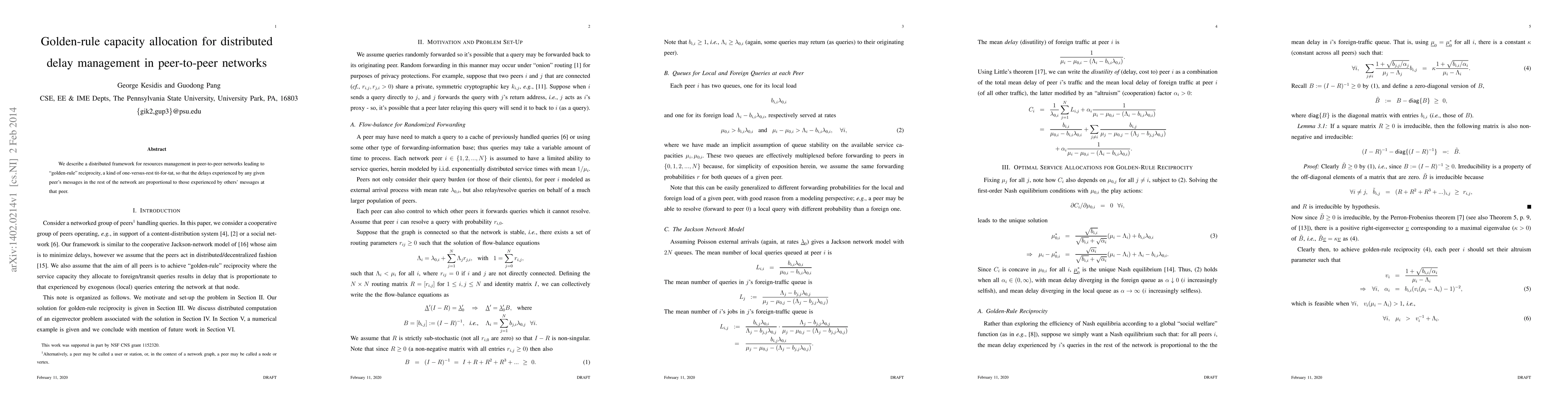 This paper proposes a distributed framework for managing resources in peer-to-peer networks, aiming to achieve golden-rule reciprocity, where delays experienced by peers' messages are proportional to those of others' messages at that peer, ensuring fair delay management.