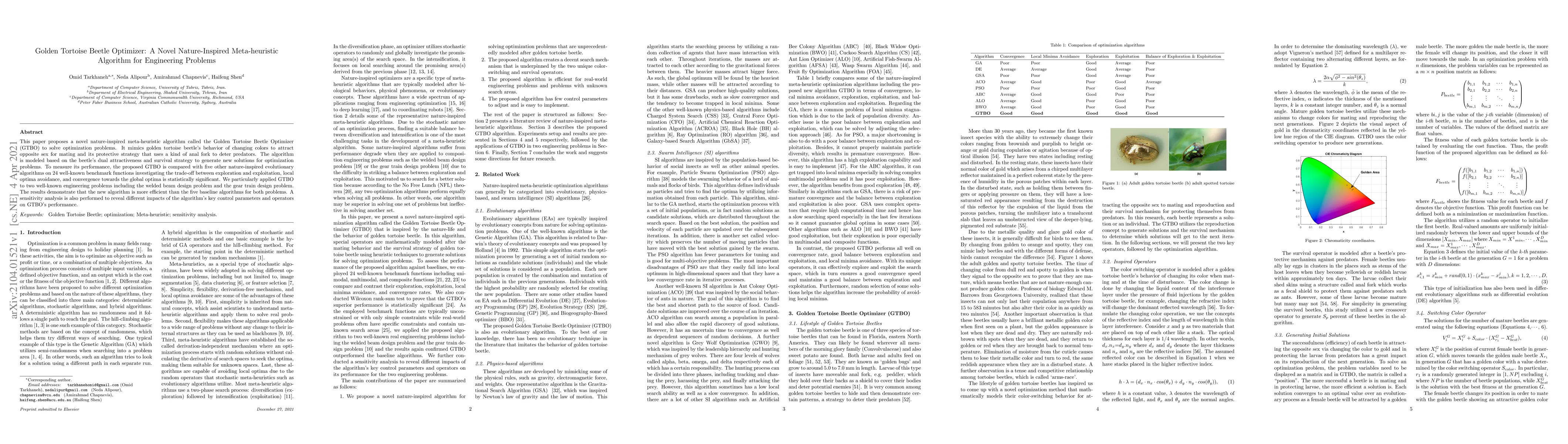 The Golden Tortoise Beetle Optimizer (GTBO) is a new meta-heuristic algorithm inspired by the mating and survival behaviors of golden tortoise beetles. It outperforms five other evolutionary algorithms on benchmark functions and is effective for engineering design problems, as shown by its application to welded beam and gear train design.