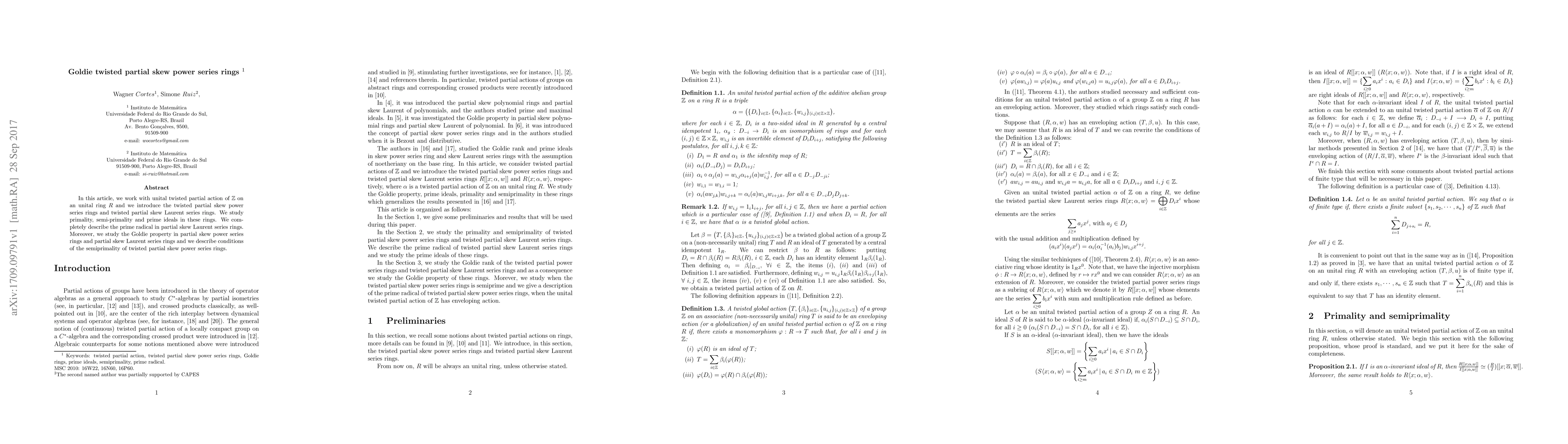 In this article, we work with unital twisted partial action of $\mathbb{Z}$ on an unital ring $R$ and we introduce the twisted partial skew power series rings and twisted partial skew Laurent series rings. We study primality, semi-primality and prime ideals in these rings. We completely describe the prime radical in partial skew Laurent series rings. Moreover, we study the Goldie property in partial skew power series rings and partial skew Laurent series rings and we describe conditions of the semiprimality of twisted partial skew power series rings.