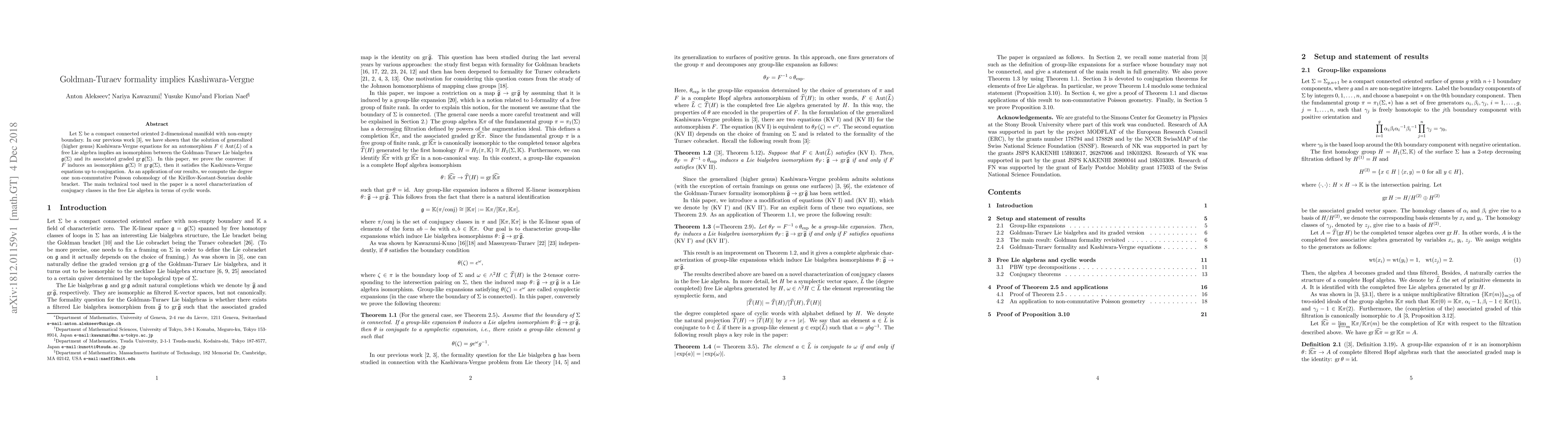 Let $\Sigma$ be a compact connected oriented 2-dimensional manifold with non-empty boundary. In our previous work, we have shown that the solution of generalized (higher genus) Kashiwara-Vergne equations for an automorphism $F \in {\rm Aut}(L)$ of a free Lie algebra implies an isomorphism between the Goldman-Turaev Lie bialgebra $\mathfrak{g}(\Sigma)$ and its associated graded ${\rm gr}\, \mathfrak{g}(\Sigma)$. In this paper, we prove the converse: if $F$ induces an isomorphism $\mathfrak{g}(\Sigma) \cong {\rm gr} \, \mathfrak{g}(\Sigma)$, then it satisfies the Kashiwara-Vergne equations up to conjugation. As an application of our results, we compute the degree one non-commutative Poisson cohomology of the Kirillov-Kostant-Souriau double bracket. The main technical tool used in the paper is a novel characterization of conjugacy classes in the free Lie algebra in terms of cyclic words.
