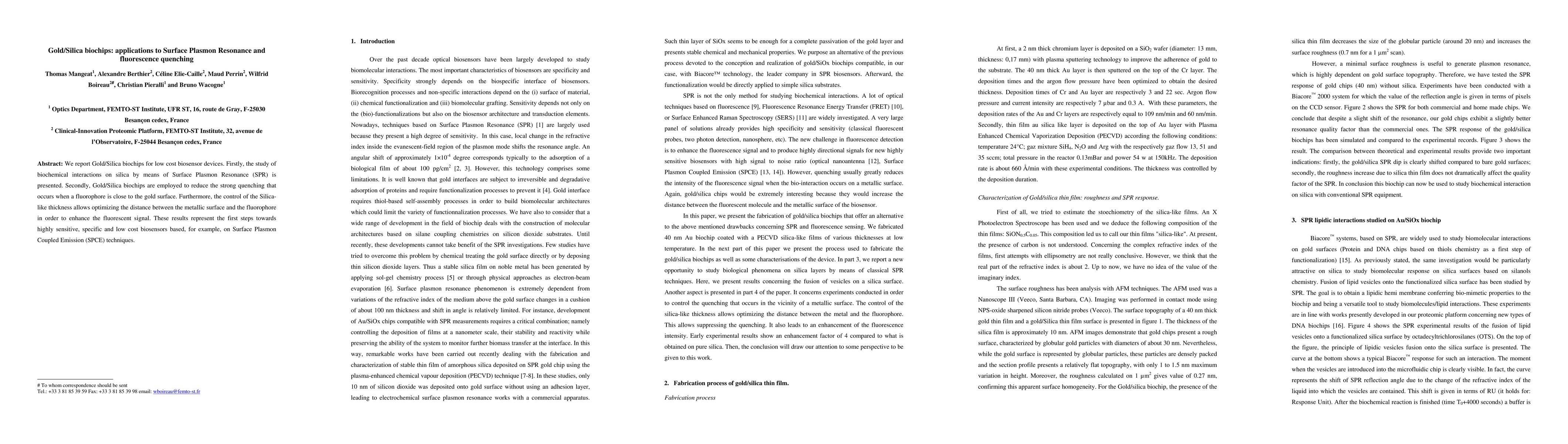 Gold/Silica biochips are developed for low-cost biosensor applications, utilizing Surface Plasmon Resonance (SPR) to study biochemical interactions. The biochips also mitigate fluorescence quenching near gold surfaces, optimizing silica thickness to enhance the fluorescent signal.