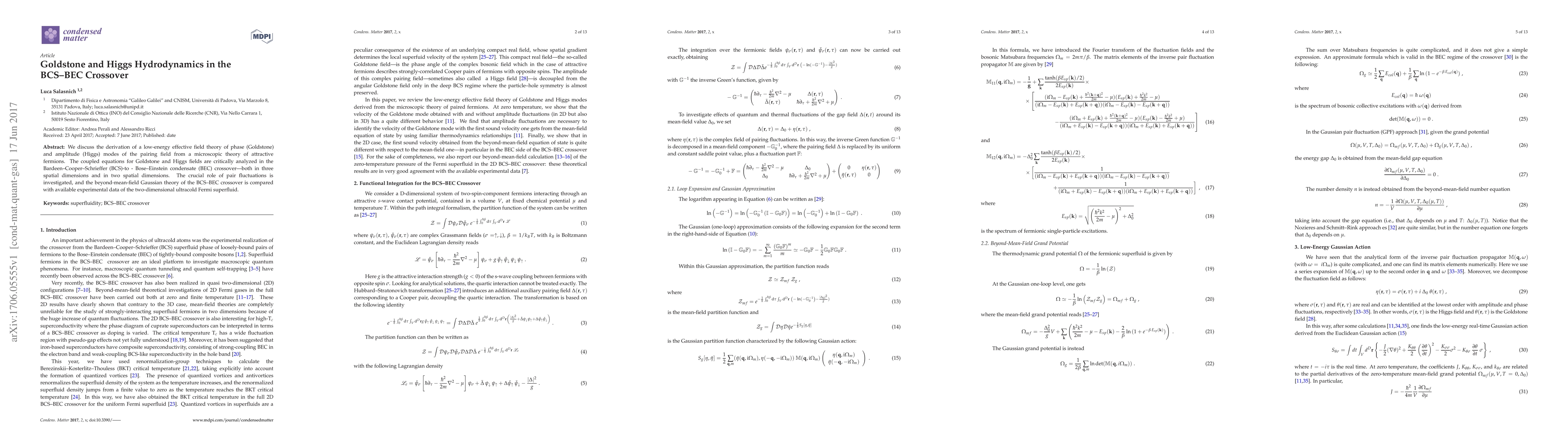 We discuss the derivation of a low-energy effective field theory of phase (Goldstone) and amplitude (Higgs) modes of the pairing field from a microscopic theory of attractive fermions. The coupled equations for Goldstone and Higgs fields are critically analyzed in the Bardeen-Cooper-Schrieffer (BCS) to Bose-Einstein condensate (BEC) crossover both in three spatial dimensions and in two spatial dimensions. The crucial role of pair fluctuations is investigated, and the beyond-mean-field Gaussian theory of the BCS-BEC crossover is compared with available experimental data of the two-dimensional ultracold Fermi superfluid.