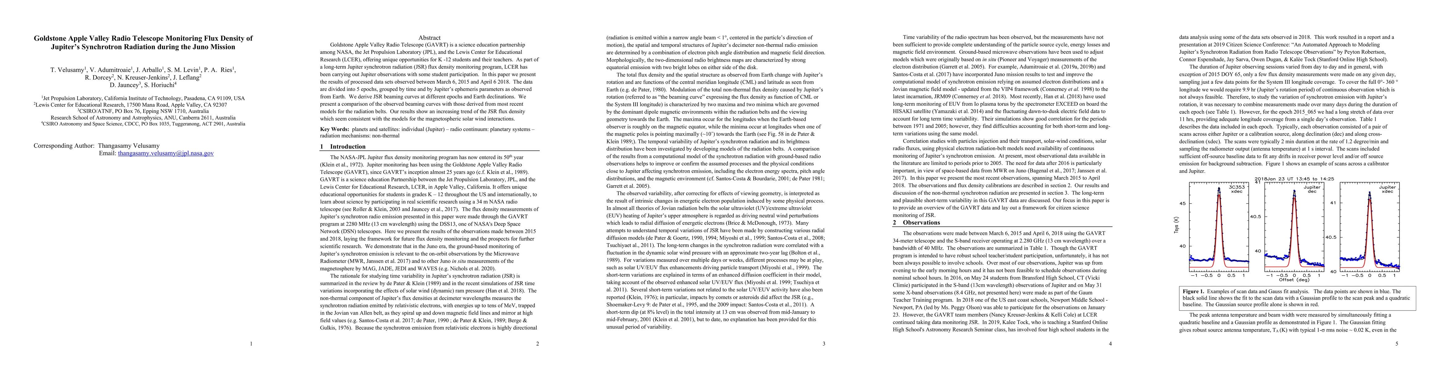 This paper reports on the Goldstone Apple Valley Radio Telescope's observations of Jupiter's synchrotron radiation flux density from March 6, 2015 to April 6, 2018. The study reveals an increasing trend in the flux density, consistent with models of magnetospheric solar wind interactions, and compares observed beaming curves with recent radiation belt models.