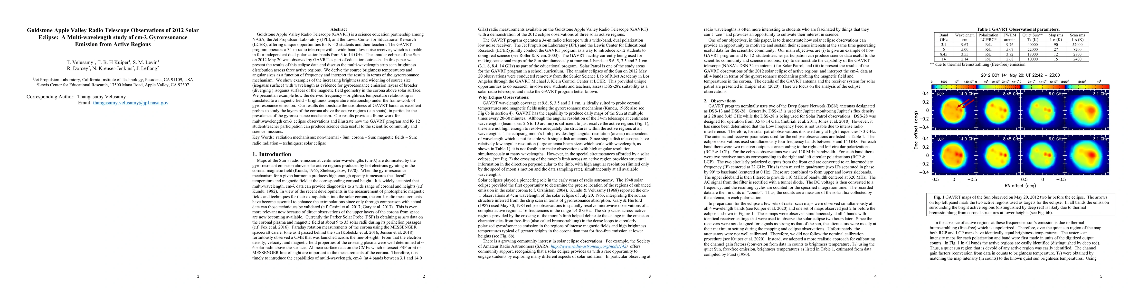 The Goldstone Apple Valley Radio Telescope (GAVRT) observed the 2012 solar eclipse, capturing multi-wavelength data on gyroresonance emission from active regions. The study reveals increasing brightness and widening source sizes with wavelength, indicating gyroresonance emission layers in the solar corona, and demonstrates the GAVRT's effectiveness in studying coronal magnetic fields.