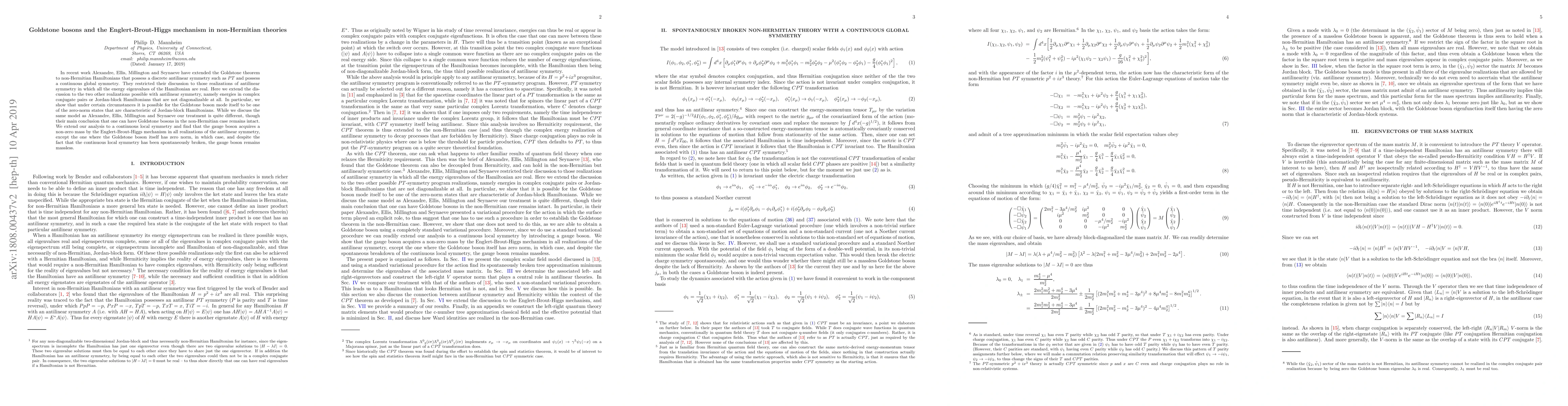 This paper extends the Goldstone theorem to non-Hermitian Hamiltonians with antilinear symmetries, showing that Goldstone bosons can exist even when Hamiltonians are not diagonalizable. It demonstrates that a standard variational procedure can establish the Goldstone theorem without requiring special surface terms, and that the Englert-Brout-Higgs mechanism can still apply, giving a gauge boson mass except when the Goldstone boson itself is zero-norm.