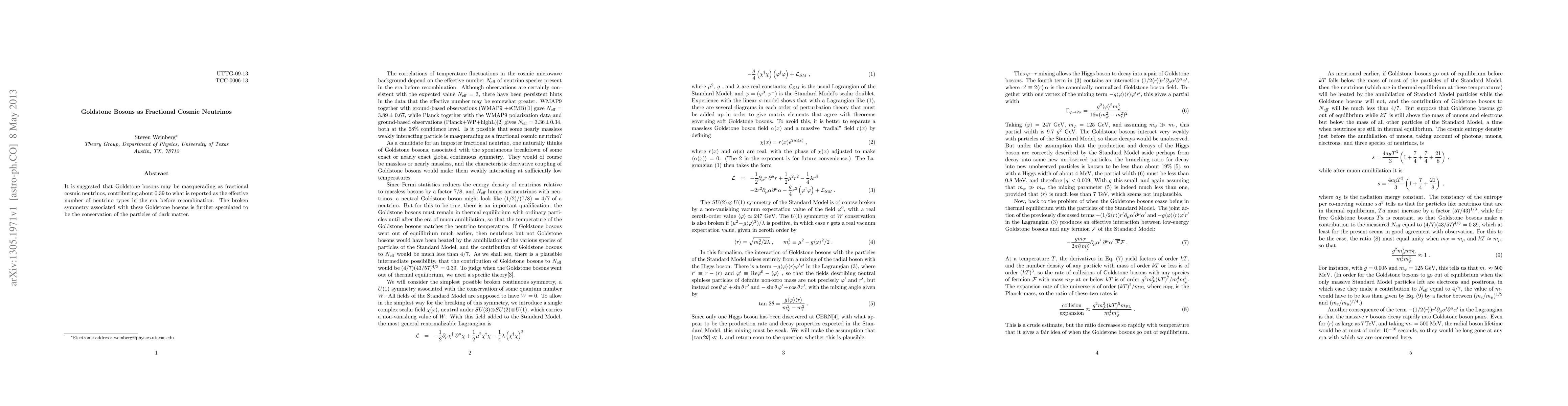 This paper proposes that Goldstone bosons could be mistaken for fractional cosmic neutrinos, adding approximately 0.39 to the effective number of neutrino types before recombination. The study also hypothesizes that the broken symmetry linked to these bosons may relate to the conservation of dark matter particles.