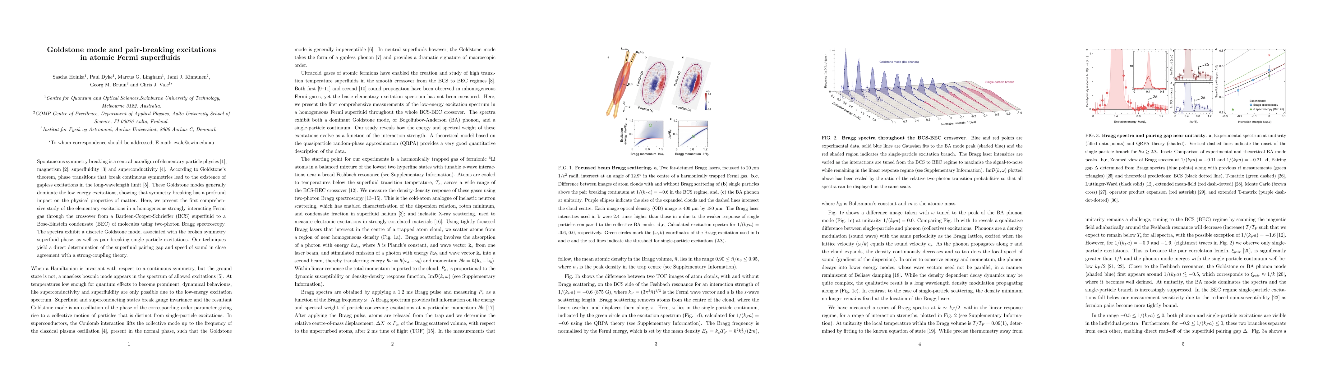 Spontaneous symmetry breaking is a central paradigm of elementary particle physics, magnetism, superfluidity and superconductivity. According to Goldstone's theorem, phase transitions that break continuous symmetries lead to the existence of gapless excitations in the long-wavelength limit. These Goldstone modes generally dominate the low-energy excitations, showing that symmetry breaking has a profound impact on the physical properties of matter. Here, we present the first comprehensive study of the elementary excitations in a homogeneous strongly interacting Fermi gas through the crossover from a Bardeen-Cooper-Schrieffer (BCS) superfluid to a Bose-Einstein condensate (BEC) of molecules using two-photon Bragg spectroscopy. The spectra exhibit a discrete Goldstone mode, associated with the broken symmetry superfluid phase, as well as pair breaking single-particle excitations. Our techniques yield a direct determination of the superfluid pairing gap and speed of sound in close agreement with a strong-coupling theory.