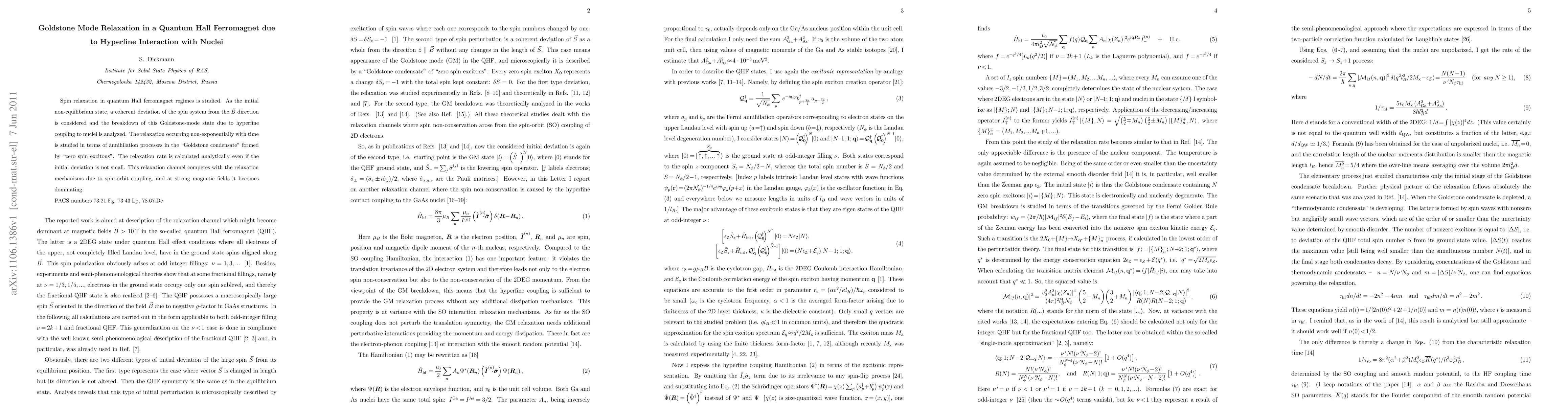 This paper investigates spin relaxation in quantum Hall ferromagnets, focusing on the breakdown of a Goldstone-mode state due to hyperfine interactions with nuclei. The relaxation process, characterized by non-exponential time dependence, is analyzed through annihilation processes in the "Goldstone condensate," with the relaxation rate calculated analytically, showing dominance over spin-orbit coupling at strong magnetic fields.