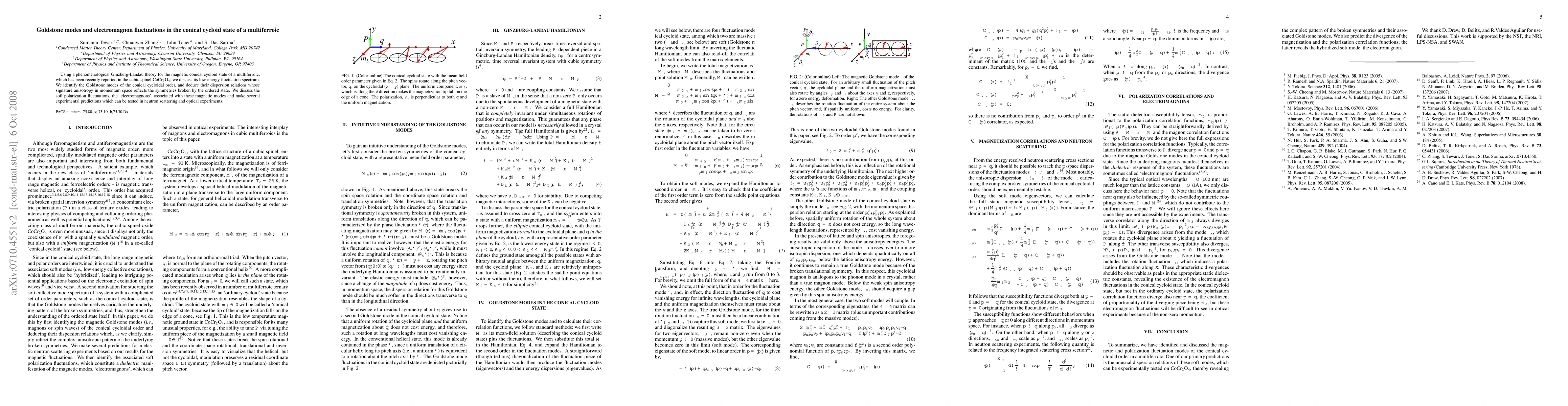 This paper investigates the low-energy fluctuation spectrum of a multiferroic material with conical cycloid order, identifying Goldstone modes and electromagnon fluctuations that can be tested in neutron scattering and optical experiments.