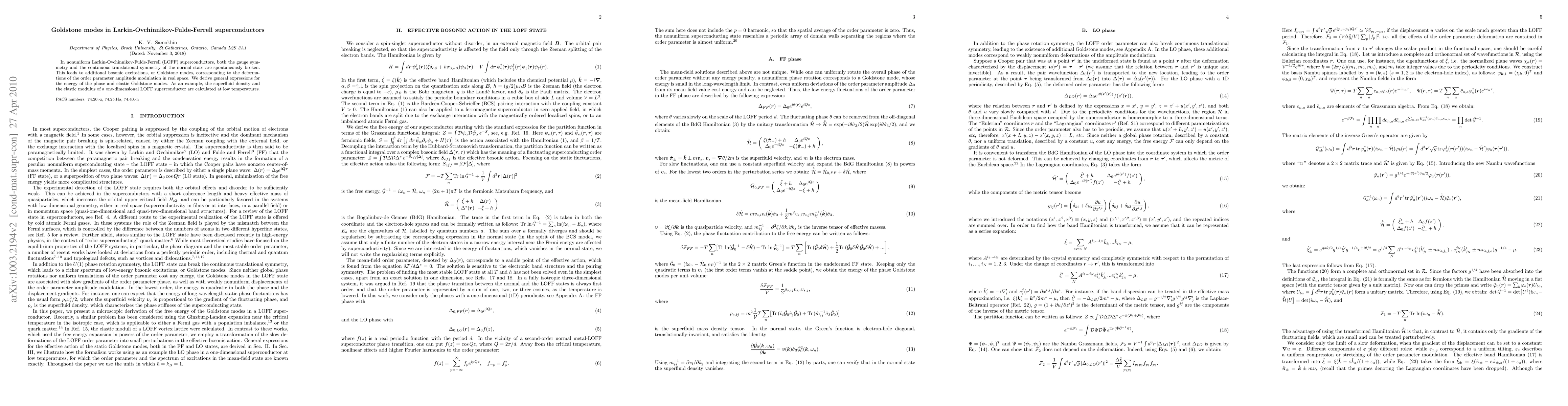 This paper investigates Goldstone modes in nonuniform Larkin-Ovchinnikov-Fulde-Ferrell (LOFF) superconductors, deriving expressions for their energies and examining phase and elastic modes, with a specific calculation for the superfluid density and elastic modulus in a one-dimensional LOFF superconductor at low temperatures.