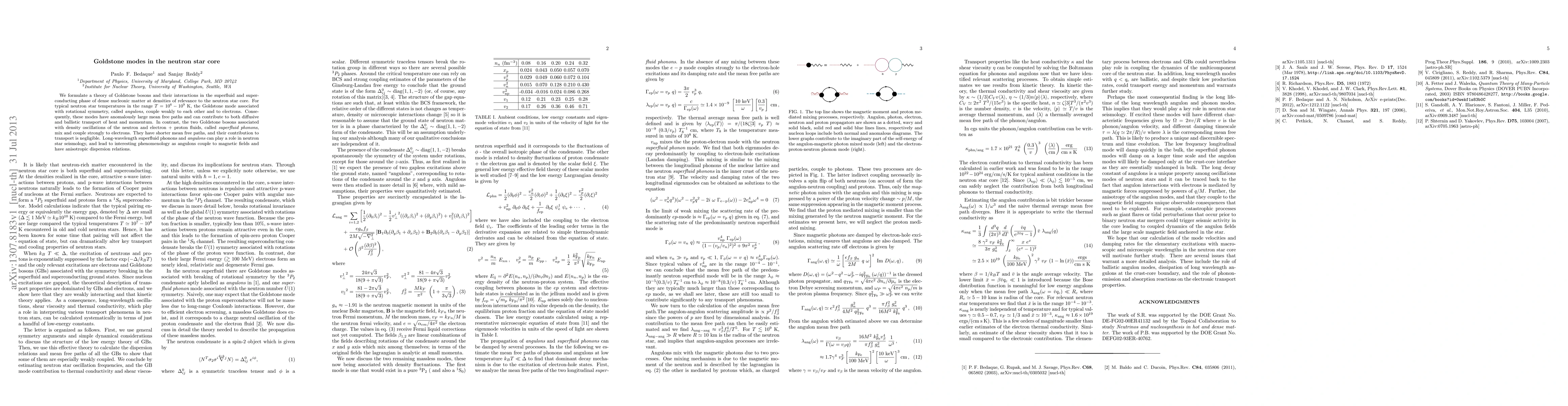 We formulate a theory of Goldstone bosons and their interactions in the superfluid and superconducting phase of dense nucleonic matter at densities of relevance to the neutron star core. For typical neutron star temperatures in the range T = 10^6 to 10^9 K, the Goldstone mode associated with rotational symmetry, called angulons, couple weakly to each other and to electrons. Consequently, these modes have anomalously large mean free paths and can contribute to both diffusive and ballistic transport of heat and momentum. In contrast, the two Goldstone bosons associated with density oscillations of the neutron and electron + proton fluids, called superfluid phonons, mix and couple strongly to electrons. They have shorter mean free paths, and their contribution to transport is negligible. Long-wavelength superfluid phonons and angulons can play a role in neutron star seismology, and lead to interesting phenomenology as angulons couple to magnetic fields and have anisotropic dispersion relations.