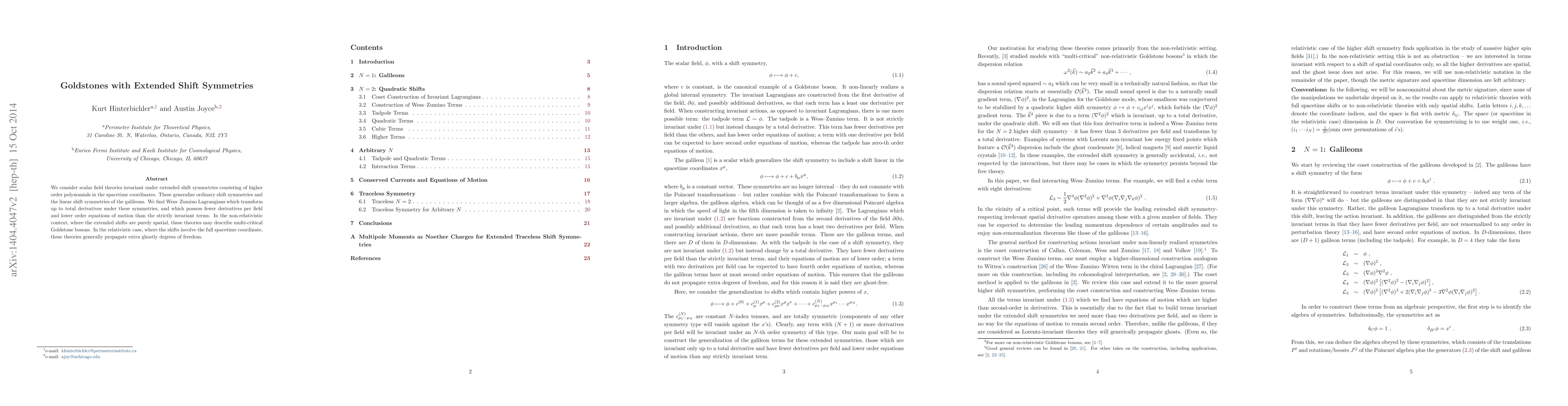 We consider scalar field theories invariant under extended shift symmetries consisting of higher order polynomials in the spacetime coordinates. These generalize ordinary shift symmetries and the linear shift symmetries of the galileons. We find Wess-Zumino Lagrangians which transform up to total derivatives under these symmetries, and which possess fewer derivatives per field and lower order equations of motion than the strictly invariant terms. In the non-relativistic context, where the extended shifts are purely spatial, these theories may describe multi-critical Goldstone bosons. In the relativistic case, where the shifts involve the full spacetime coordinate, these theories generally propagate extra ghostly degrees of freedom.