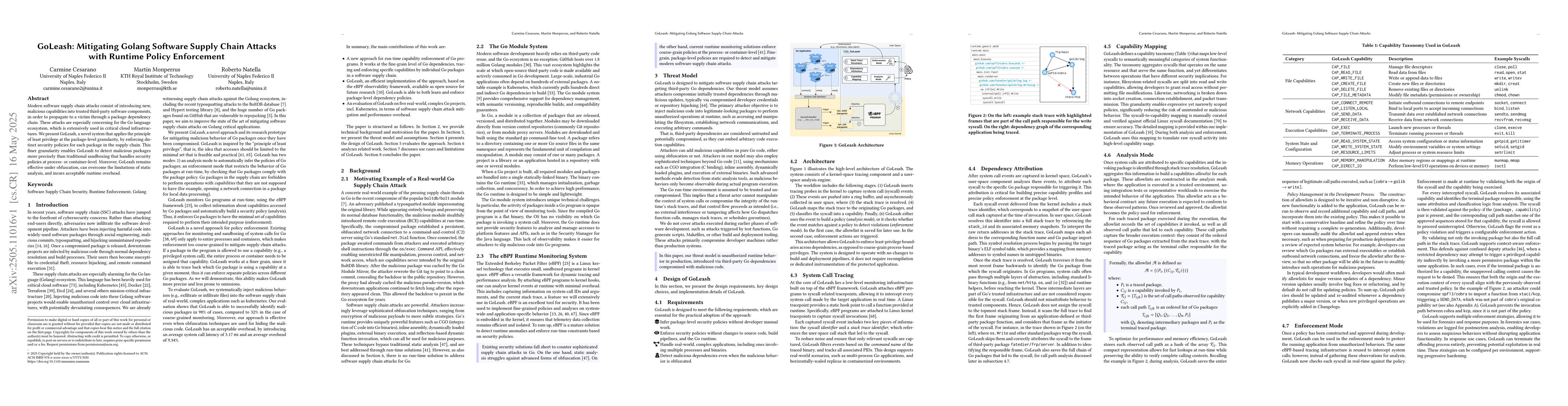 GoLeash mitigates software supply chain attacks in Go ecosystems by applying package-level security policies, offering precise detection of malicious packages and acceptable runtime overhead.