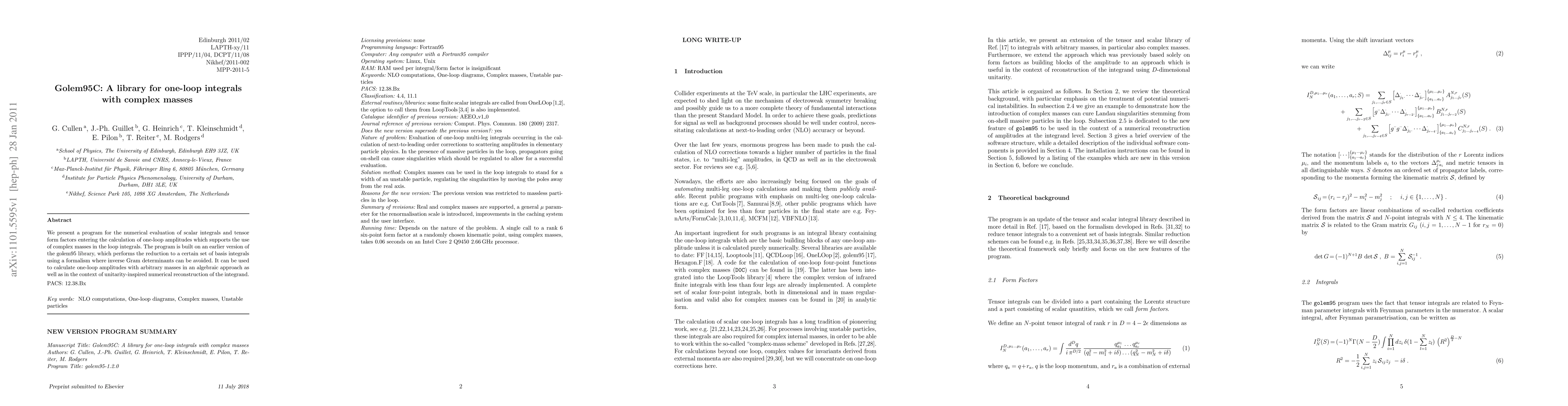 We present a program for the numerical evaluation of scalar integrals and tensor form factors entering the calculation of one-loop amplitudes which supports the use of complex masses in the loop integrals. The program is built on an earlier version of the golem95 library, which performs the reduction to a certain set of basis integrals using a formalism where inverse Gram determinants can be avoided. It can be used to calculate one-loop amplitudes with arbitrary masses in an algebraic approach as well as in the context of a unitarity-inspired numerical reconstruction of the integrand.