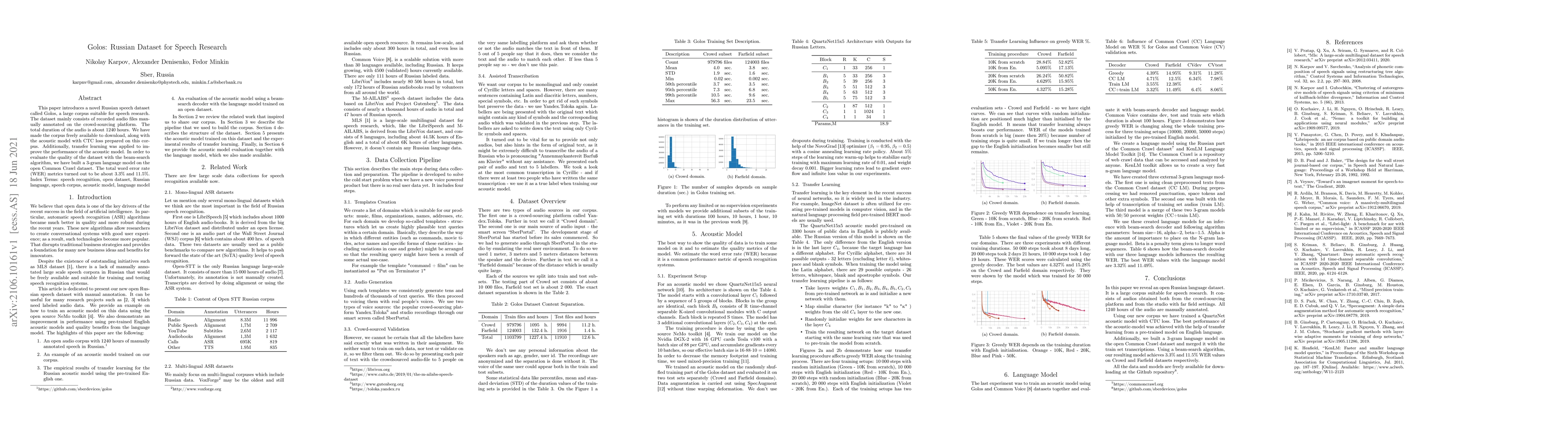 This paper introduces a novel Russian speech dataset called Golos, a large corpus suitable for speech research. The dataset mainly consists of recorded audio files manually annotated on the crowd-sourcing platform. The total duration of the audio is about 1240 hours. We have made the corpus freely available to download, along with the acoustic model with CTC loss prepared on this corpus. Additionally, transfer learning was applied to improve the performance of the acoustic model. In order to evaluate the quality of the dataset with the beam-search algorithm, we have built a 3-gram language model on the open Common Crawl dataset. The total word error rate (WER) metrics turned out to be about 3.3% and 11.5%.