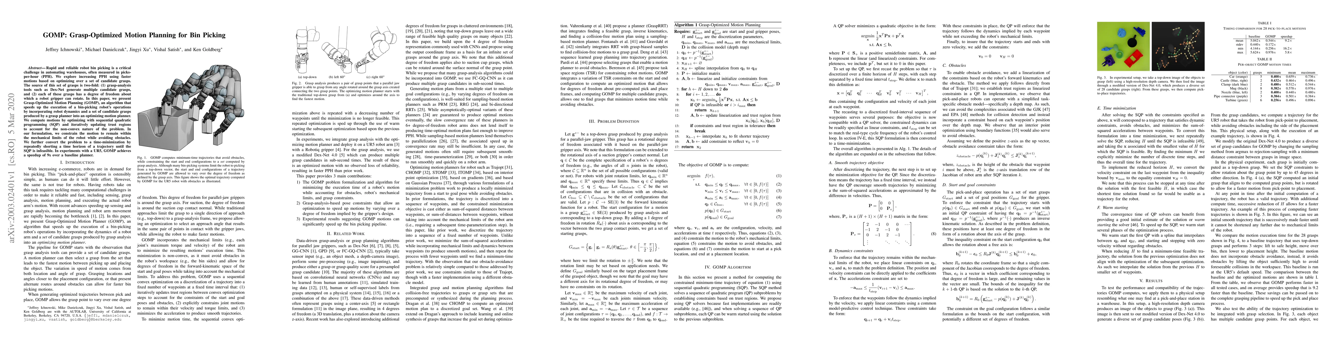The GOMP algorithm optimizes bin-picking robot motion by integrating robot dynamics and candidate grasps into a motion planner, achieving a 9x speedup over a baseline planner by minimizing execution time using sequential quadratic programming. The approach effectively constrains motion within mechanical limits and avoids obstacles.
