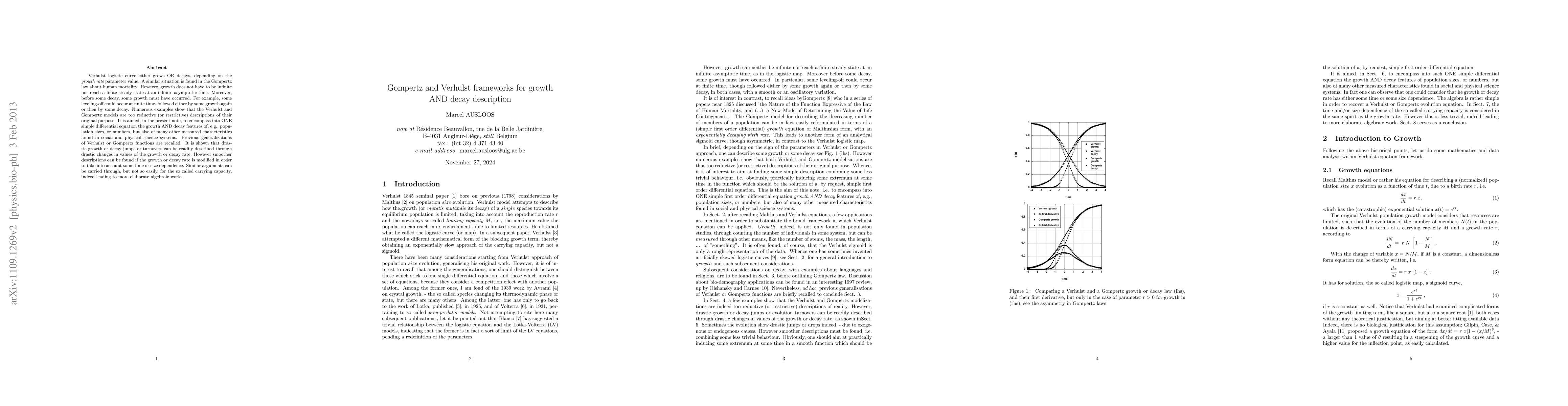 Verhulst logistic curve either grows OR decays, depending on the {\it growth rate} parameter value. A similar situation is found in the Gompertz law about human mortality. However, growth can neither be infinite nor reach a finite steady state at an infinite asymptotic time. Moreover before some decay, some growth must have occurred. For example, some levelling-off could occur at finite time, followed either by some growth again or then by some decay. Numerous examples show that the Verhulst and Gompertz modelisations are too reductive (or restrictive) descriptions of their original purpose. It is aimed, in the present note, to encompass into ONE simple differential equation the growth AND decay features of, e.g., population sizes, or numbers, but also of many other measured characteristics found in social and physical science systems. Previous generalisations of Verhulst or Gompertz functions are recalled. It is shown that drastic growth or decay jumps or turnovers can be readily described through drastic changes in values of the growth or decay rate. However smoother descriptions can be found if the growth or decay rate is modified in order to take into account some time or size dependence. Similar arguments can be carried through, but not so easily, for the so called carrying capacity, indeed leading to more elaborate algebraic work.
