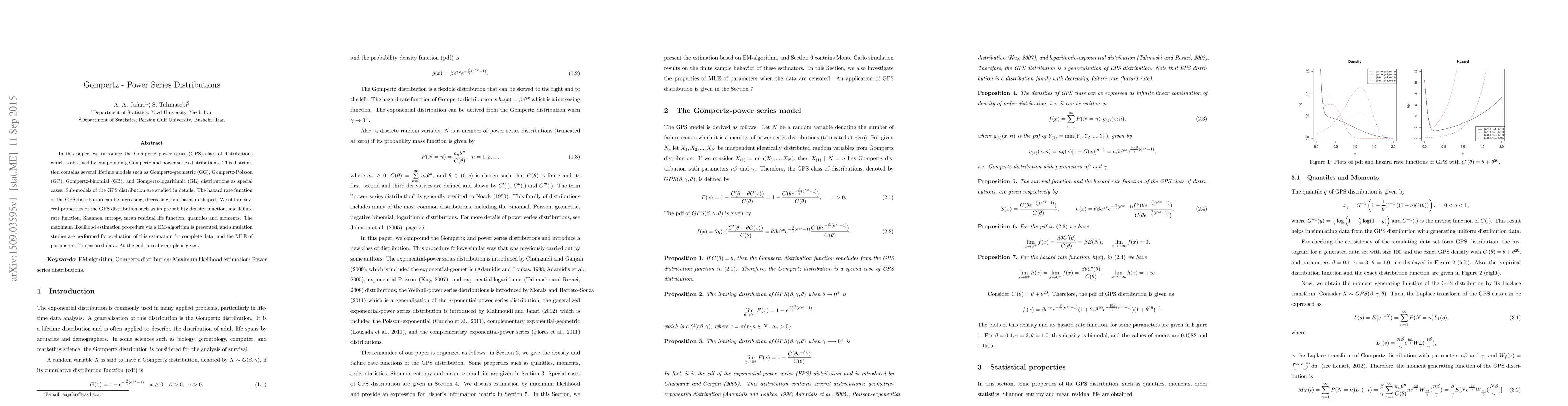This paper introduces the Gompertz power series (GPS) distribution, obtained by compounding Gompertz and power series distributions, and studies its properties, including various sub-models and the hazard rate function. It presents the maximum likelihood estimation using an EM-algorithm and evaluates it through simulation studies, followed by an application on real data.