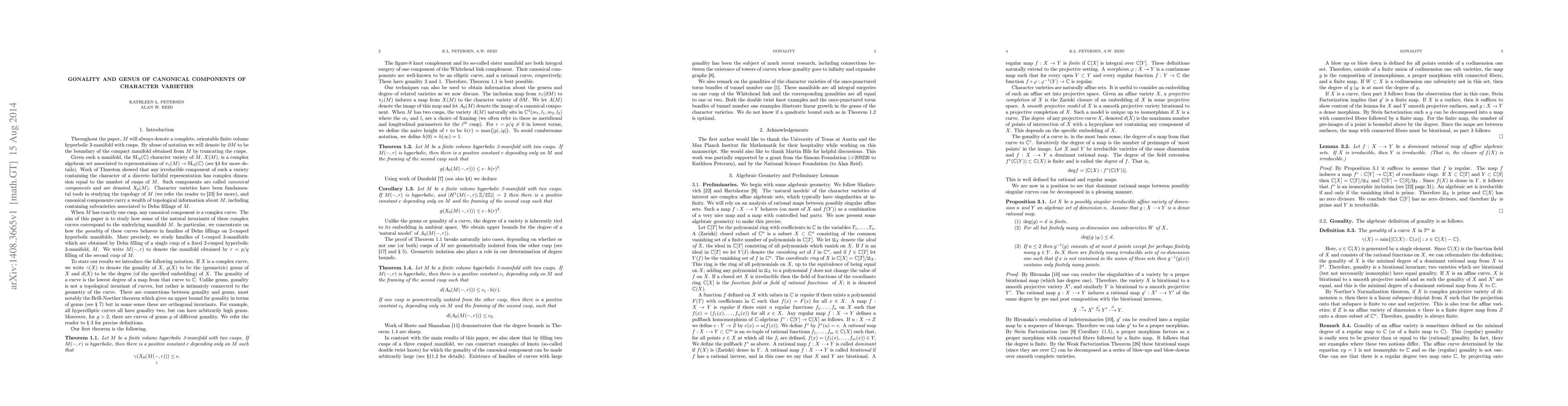 Let M be a two cusped hyperbolic 3-manifold and let M(r) be the result of r Dehn filling of a fixed cusp of M. We study canonical components of the SL(2,C) character varieties of M(r). We show that the gonality of these sets is bounded, independent of the filling parameter. We also obtain bounds, depending on r, for the genus of these sets. We compute the gonality for the double twist knots, demonstrating canonical components with arbitrarily large gonality.