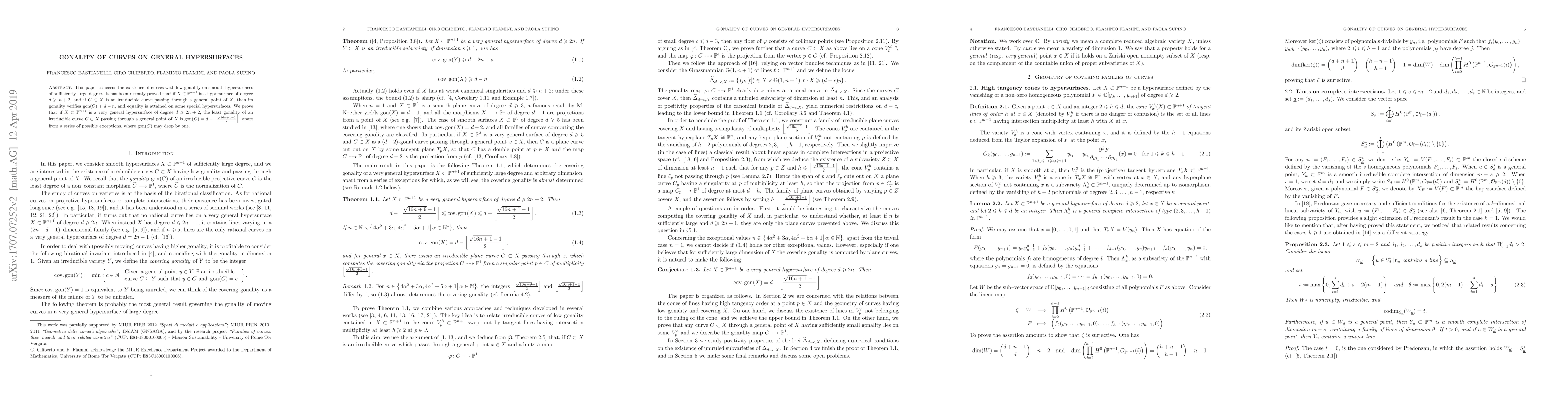 This paper concerns the existence of curves with low gonality on smooth hypersurfaces of sufficiently large degree. It has been recently proved that if $X\subset \mathbb{P}^{n+1}$ is a hypersurface of degree $d\geq n+2$, and if $C\subset X$ is an irreducible curve passing through a general point of $X$, then its gonality verifies $\mathrm{gon}(C)\geq d-n$, and equality is attained on some special hypersurfaces. We prove that if $X\subset \mathbb{P}^{n+1}$ is a very general hypersurface of degree $d\geq 2n+2$, the least gonality of an irreducible curve $C\subset X$ passing through a general point of $X$ is $\mathrm{gon}(C)=d-\left\lfloor\frac{\sqrt{16n+1}-1}{2}\right\rfloor$, apart from a series of possible exceptions, where $\mathrm{gon}(C)$ may drop by one.