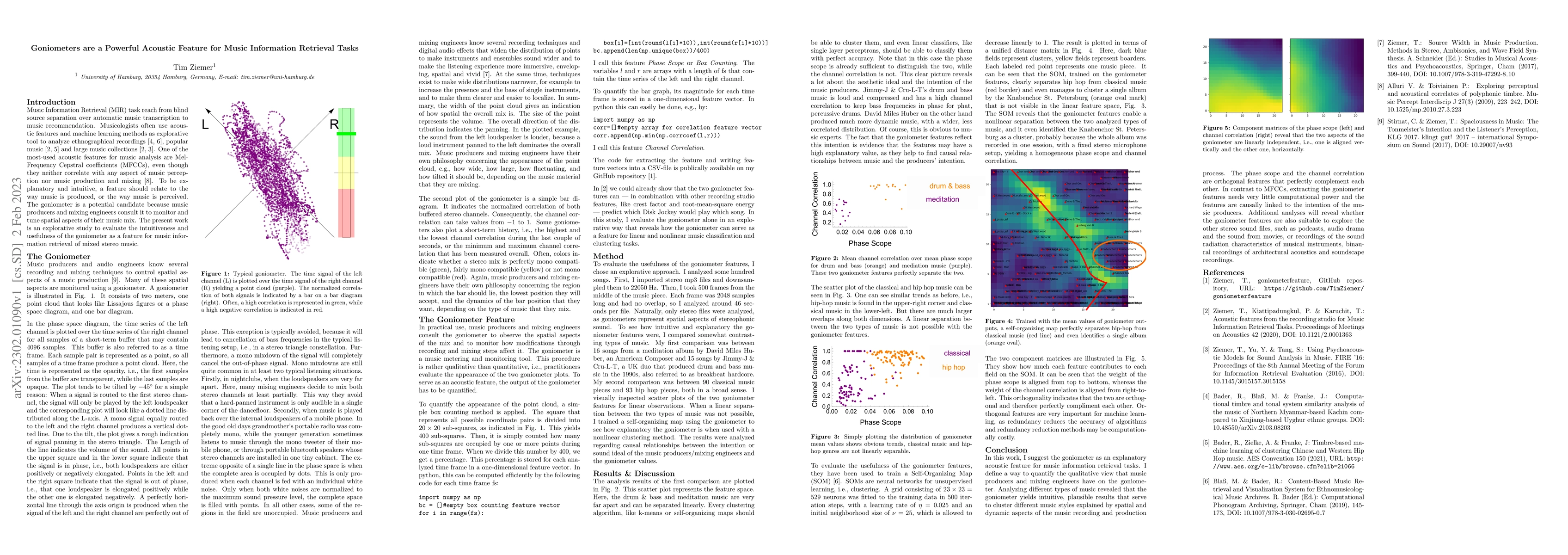 Goniometers, also known as Phase Scopes or Vector Scopes, are audio metering tools that help music producers and mixing engineers monitor spatial aspects of a music mix, such as the stereo panorama, the width of single sources, the amount and diffuseness of reverberation as well as phase cancellations that may occur on the sweet-spot and in a mono-mixdown. In addition, they implicitly inform about the dynamics of the sound. Self-organizing maps trained with a goniometer, are consulted to explore the usefulness of this acoustic feature for music information retrieval tasks. One can see that goniometers are able to classify different genres and cluster a single album. The advantage of goniometers is the causality: Music producers and mixing engineers consciously consult goniometers to reach their desired sound, which is not the case for other acoustic features, from Zero-Crossing Rate to Mel-Frequency Cepstral Coefficients.