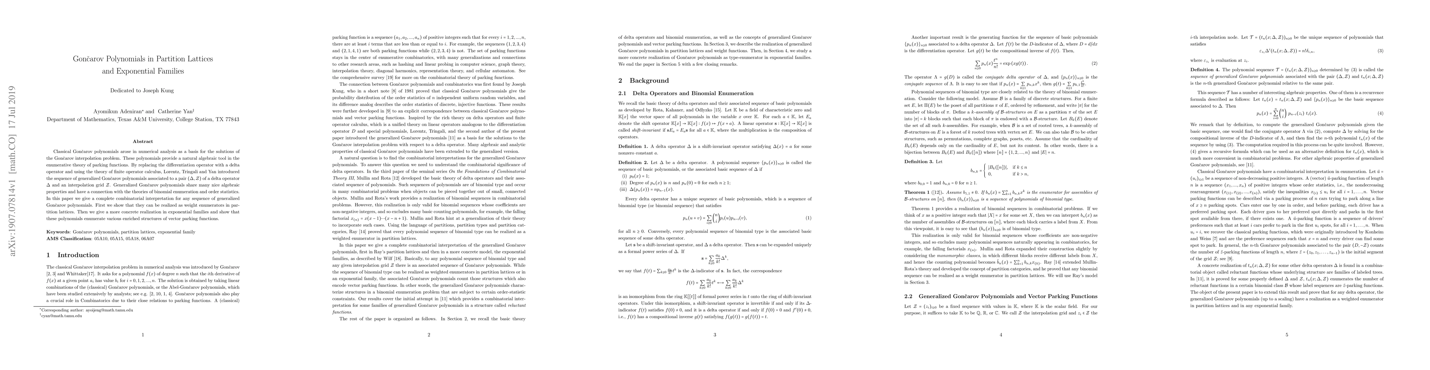 Classical Gon\v{c}arov polynomials arose in numerical analysis as a basis for the solutions of the Gon\v{c}arov interpolation problem. These polynomials provide a natural algebraic tool in the enumerative theory of parking functions. By replacing the differentiation operator with a delta operator and using the theory of finite operator calculus, Lorentz, Tringali and Yan introduced the sequence of generalized Gon\v{c}arov polynomials associated to a pair $(\Delta, Z)$ of a delta operator $\Delta$ and an interpolation grid $Z$. Generalized Gon\v{c}arov polynomials share many nice algebraic properties and have a connection with the theories of binomial enumeration and order statistics. In this paper we give a complete combinatorial interpretation for any sequence of generalized Gon\v{c}arov polynomials. First, we show that they can be realized as weight enumerators in partition lattices. Then, we give a more concrete realization in exponential families and show that these polynomials enumerate various enriched structures of vector parking functions.