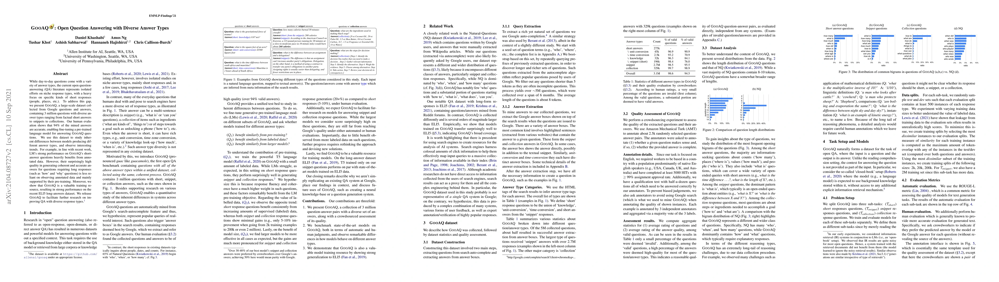 While day-to-day questions come with a variety of answer types, the current question-answering (QA) literature has failed to adequately address the answer diversity of questions. To this end, we present GooAQ, a large-scale dataset with a variety of answer types. This dataset contains over 5 million questions and 3 million answers collected from Google. GooAQ questions are collected semi-automatically from the Google search engine using its autocomplete feature. This results in naturalistic questions of practical interest that are nonetheless short and expressed using simple language. GooAQ answers are mined from Google's responses to our collected questions, specifically from the answer boxes in the search results. This yields a rich space of answer types, containing both textual answers (short and long) as well as more structured ones such as collections. We benchmarkT5 models on GooAQ and observe that: (a) in line with recent work, LM's strong performance on GooAQ's short-answer questions heavily benefit from annotated data; however, (b) their quality in generating coherent and accurate responses for questions requiring long responses (such as 'how' and 'why' questions) is less reliant on observing annotated data and mainly supported by their pre-training. We release GooAQ to facilitate further research on improving QA with diverse response types.