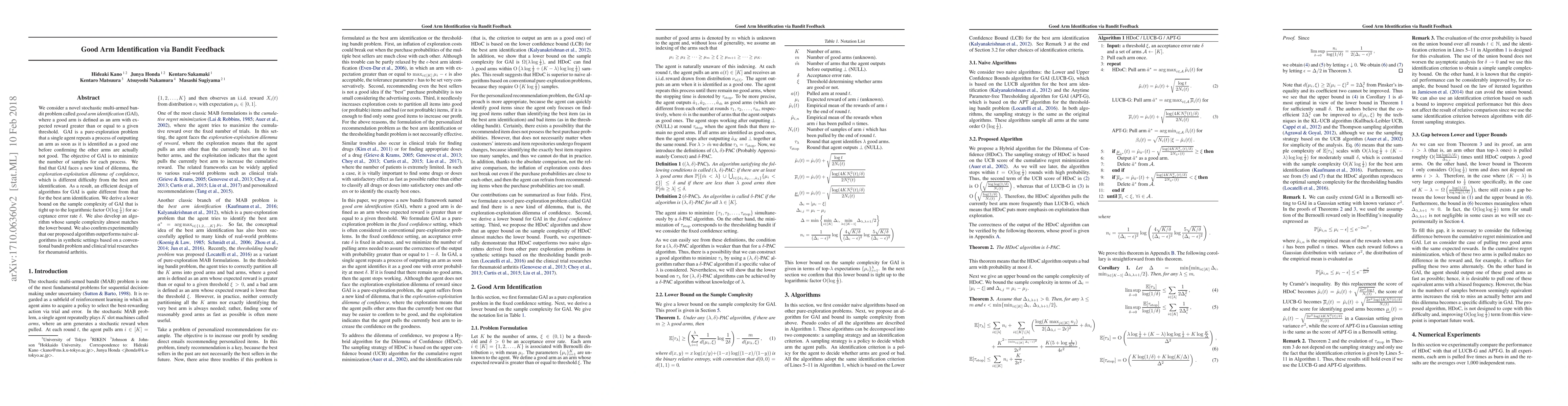 This paper introduces a stochastic multi-armed bandit problem called good arm identification (GAI), focusing on finding arms with rewards above a given threshold. It addresses a unique exploration-exploitation dilemma and proposes an efficient algorithm with sample complexity close to the derived lower bound, outperforming naive methods in experiments.