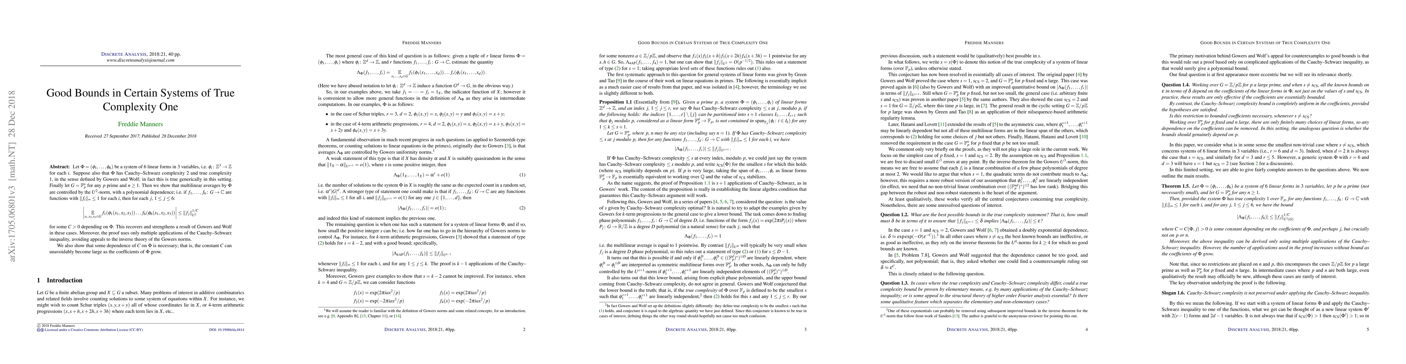 Let $\Phi = (\phi_1,\dots,\phi_6)$ be a system of $6$ linear forms in $3$ variables, i.e. $\phi_i \colon \mathbb{Z}^3 \to \mathbb{Z}$ for each $i$. Suppose also that $\Phi$ has Cauchy--Schwarz complexity $2$ and true complexity $1$, in the sense defined by Gowers and Wolf; in fact this is true generically in this setting. Finally let $G = \mathbb{F}_p^n$ for any $p$ prime and $n \ge 1$. Then we show that multilinear averages by $\Phi$ are controlled by the $U^2$-norm, with a polynomial dependence; i.e. if $f_1,\dots,f_6 \colon G \to \mathbb{C}$ are functions with $\|f_i\|_{\infty} \le 1$ for each $i$, then for each $j$, $1 \le j \le 6$: \[ \left| \mathbb{E}_{x_1,x_2,x_3 \in G} f_1(\varphi_1(x_1,x_2,x_3)) \dots f_6(\phi_6(x_1,x_2,x_3)) \right| \le \|f_j\|_{U^2}^{1/C} \] for some $C > 0$ depending on $\Phi$. This recovers and strengthens a result of Gowers and Wolf in these cases. Moreover, the proof uses only multiple applications of the Cauchy--Schwarz inequality, avoiding appeals to the inverse theory of the Gowers norms. We also show that some dependence of $C$ on $\Phi$ is necessary; that is, the constant $C$ can unavoidably become large as the coefficients of $\Phi$ grow.